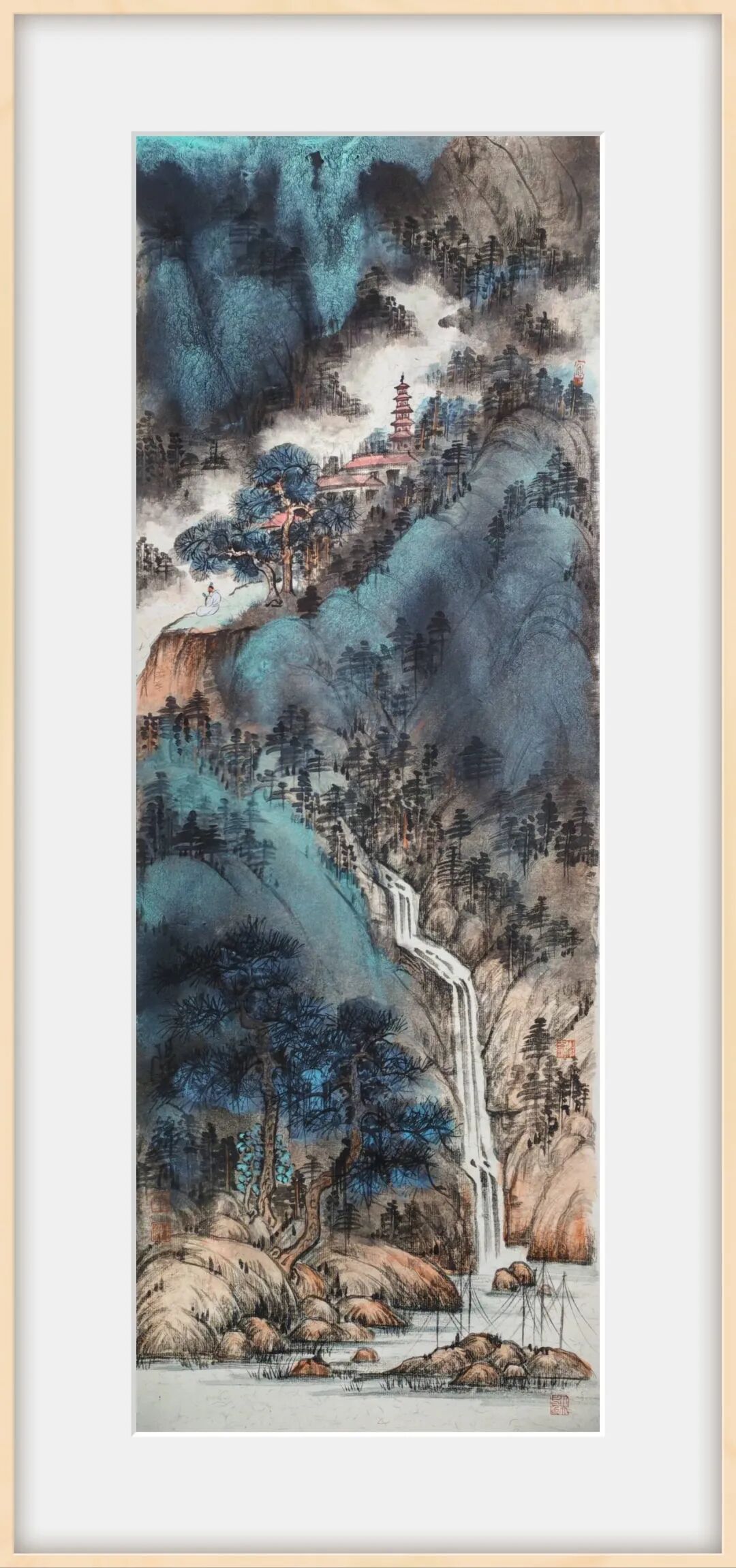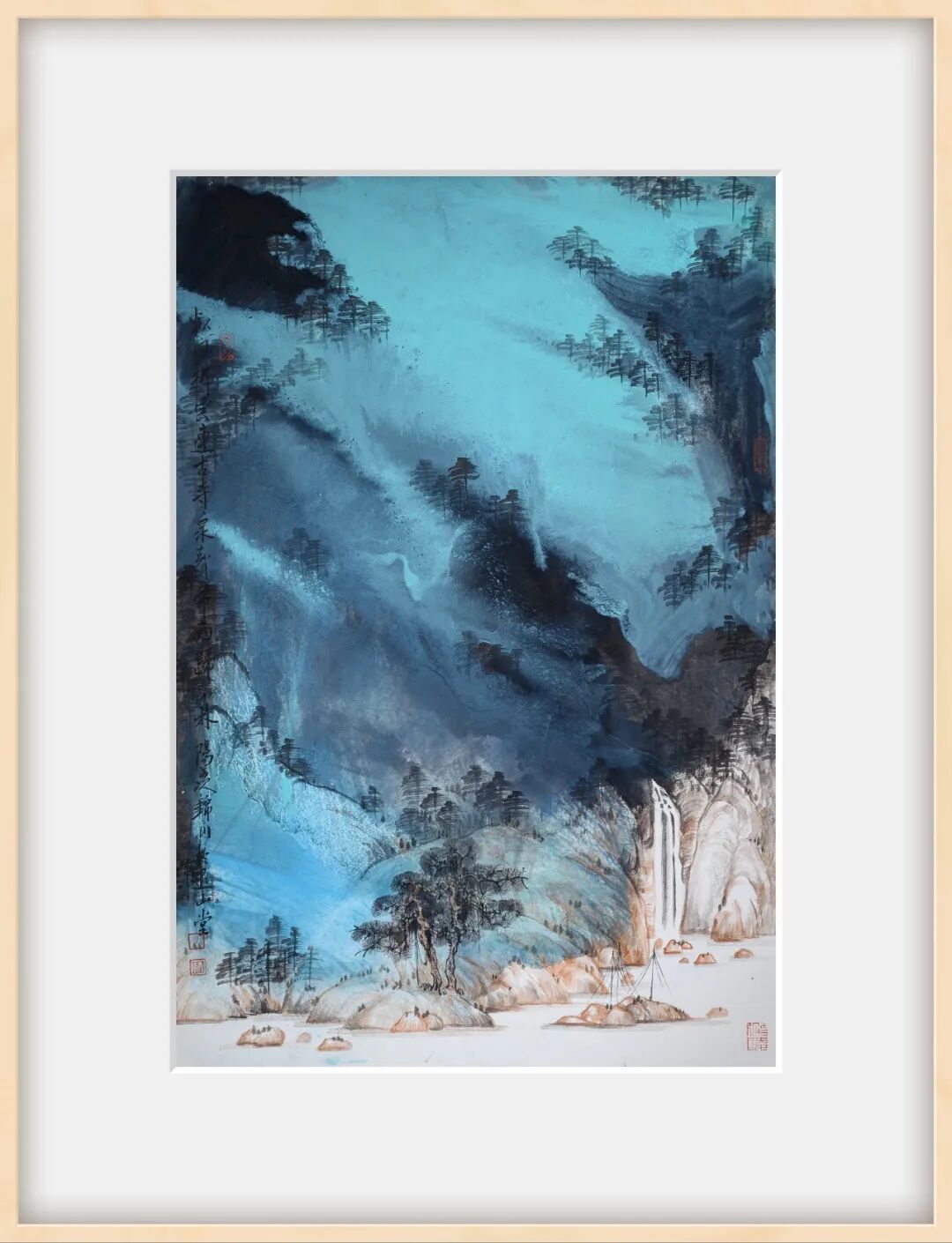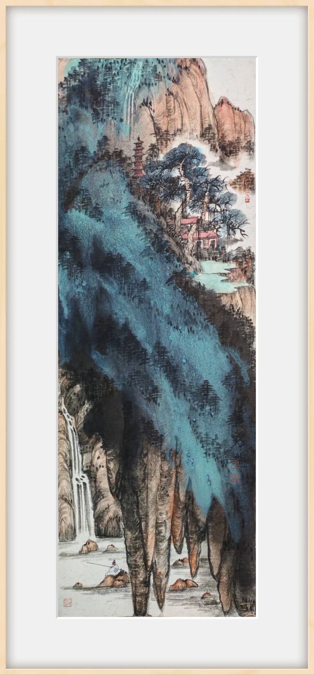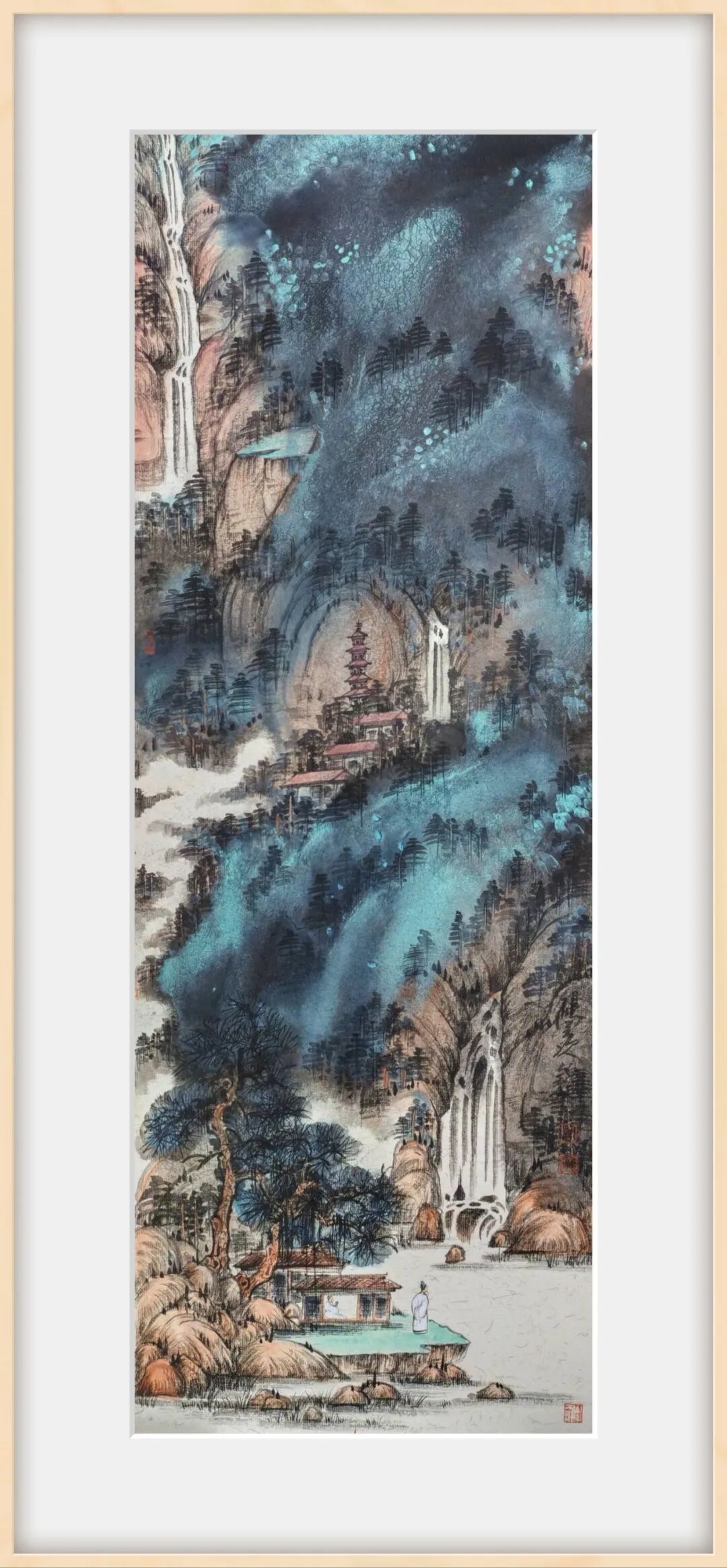 一、图式的现代性突破:从具象再现到抽象表现的跨越。吴锦川的泼彩山水打破了传统文人画“以墨为主、以色为辅”的笔墨框架,开创了以色彩为主导的新图式。视觉结构的重构:通过“破墨泼彩”技法。先以清水或淡墨铺底,再泼洒浓墨重彩进行“破”与“泼”的互动,形成半抽象的色块结构 。这种图式弱化了线条勾勒,强化了色墨渗化所产生的自然肌理与空间呼吸感。色彩的解放与主导地位:石青、石绿、朱砂等矿物颜料被大胆泼洒,使色彩从传统的填充角色跃升为独立的审美主体,形成冷暖对比强烈、流动趋势明显的视觉交响。空间的流动性表达:画面常以留白制造空间深度,如瀑布处的撞粉与天光留白形成虚实相生的效果,营造出山雨欲来、云气弥漫的动态空间感。