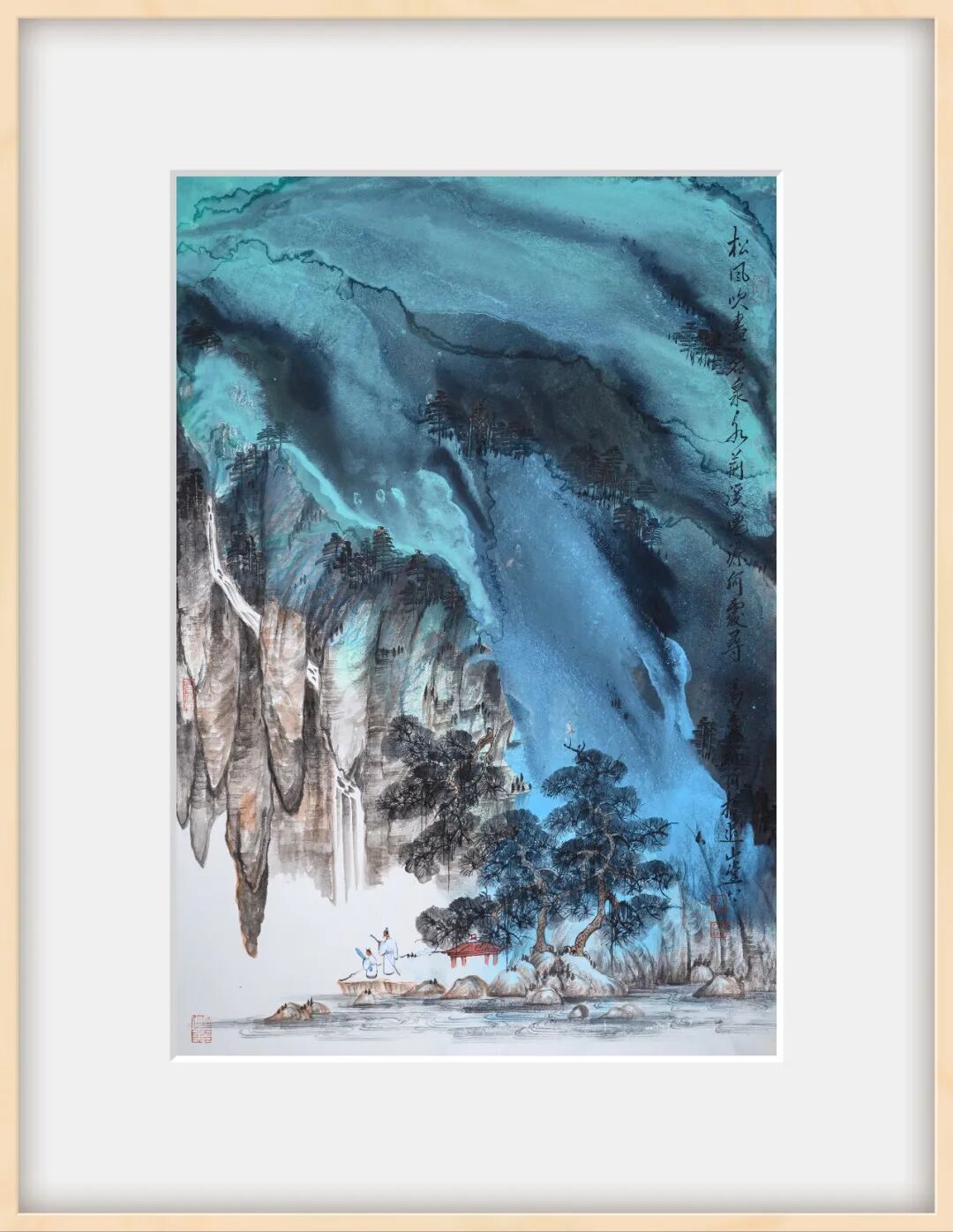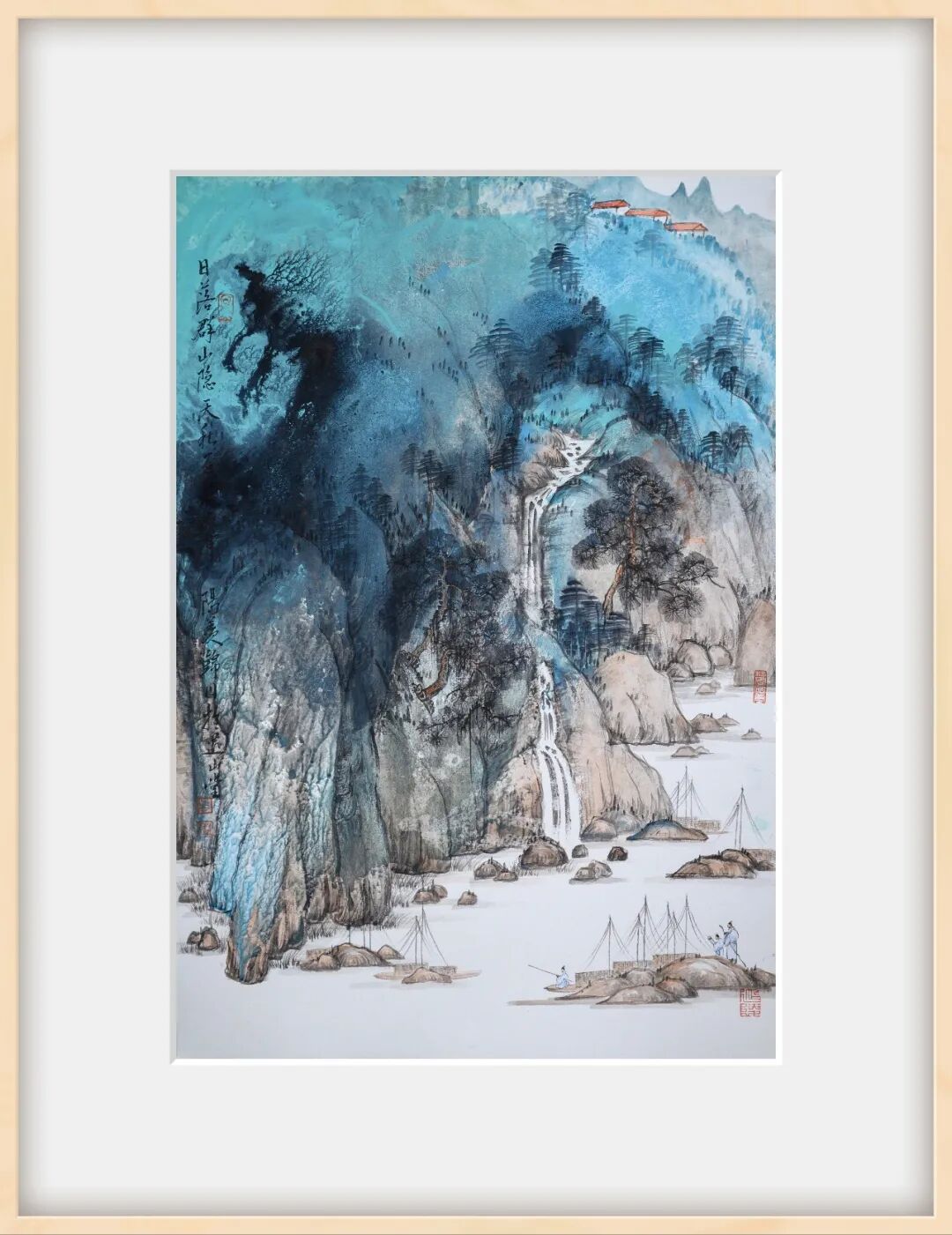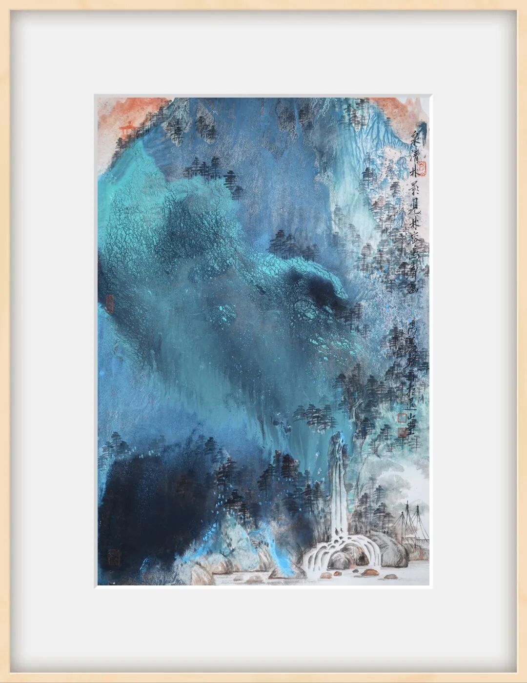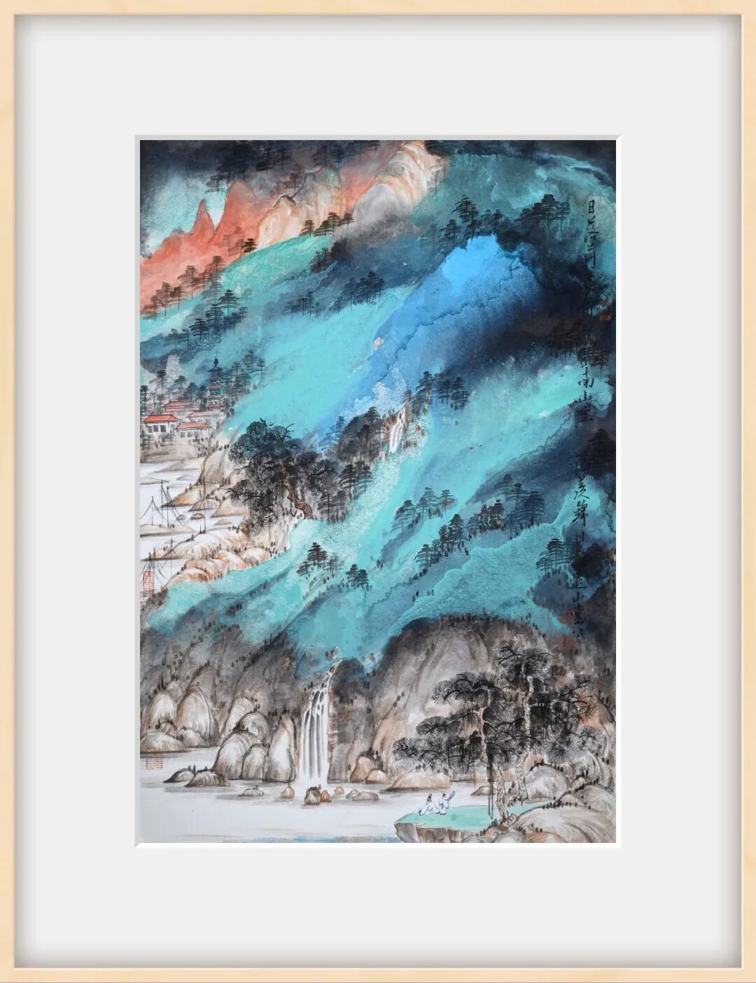 2、创作过程的抽象解构,其泼彩并非完全放任偶然,而是“破墨泼彩”的精密控制:先以淡墨或清水铺底,再泼浓墨重彩,利用宣纸的渗化特性形成自然肌理,半干时以电吹风定型,最后用细笔勾勒屋舍、舟桥、松柏等点景元素 。这一过程融合了“偶然天成”的抽象肌理与“匠心收拾”的具象结构,是“无法之法”的最高体现。3、精神内核的东方延续,尽管视觉语言极具现代感,其美学根基仍深植于道家“大象无形”与北宋“雄浑意境”之中 。泼彩的混沌色块象征宇宙初开的元气,而精细点景则引导观者进入“可游可居”的诗意世界,完成从“眼中山水”到“心中山水”的升华 。这种“虚实互融”的哲学,正是中国传统“天人合一”观的现代表达。