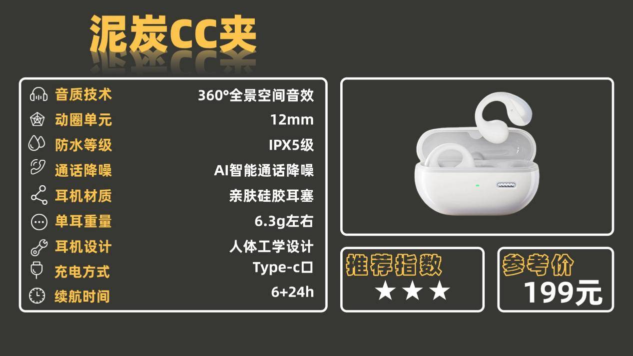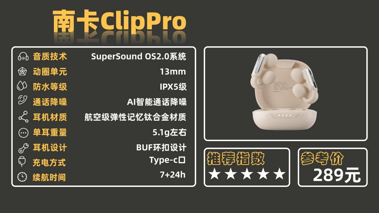 南卡Clip Pro是以“高性价比+高性能”爆火网络的款式,本身出自专业开放式老牌南卡旗下,这个品牌这两年也是经常霸榜开放式耳机口碑排名。作为一款百元级的耳夹式开放耳机,它没有学很多品牌通过砍掉核心体验来换取更低低价格来吸引用户,而纯粹通过选材、技术、工艺创新等,来提高体验。音质上,拥有新一代MCW多层复合宽环振膜+Super sound OS2.0发烧级声学系统的组合,这是南卡凭借这13年的音频研发经验,研发出的更适合耳夹式耳机的传音结构,将声音细节直线拉满!佩戴上,突破性地采用了BUF环扣人体工学设计,以及C-Hook2.0的全新佩戴方案,单个耳机仅5.1g,更贴合人耳,实现0压0感的佩戴体验!