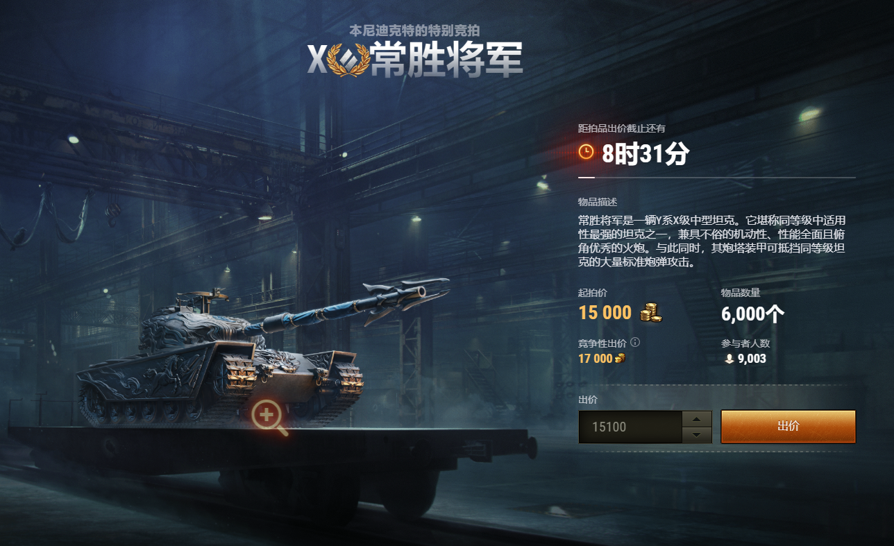 而常胜将军的拍卖形式也和昨天的SPHT一样,有一天时间竞价。底价为15000金币,符合十级特种车售价。在今晚十一点结算时,会取总出价人数的前6000名发车。在此期间,官方会给出出价中位数作为参考,方便决策。