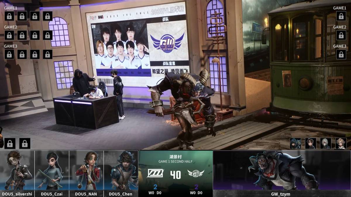DOU5的求生者选择了气象学家、哭泣小丑、守墓人、空军(BAN歌剧演员、“喧嚣”);GW的监管者tzym选择了时空之影。(BAN先知、幸运儿、小说家、杂技演员)