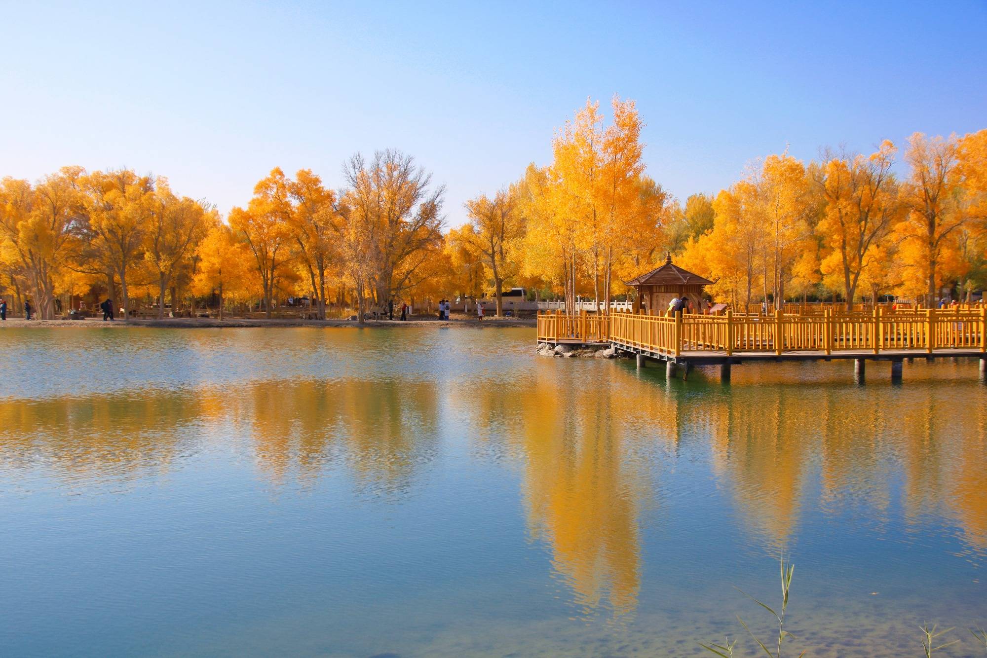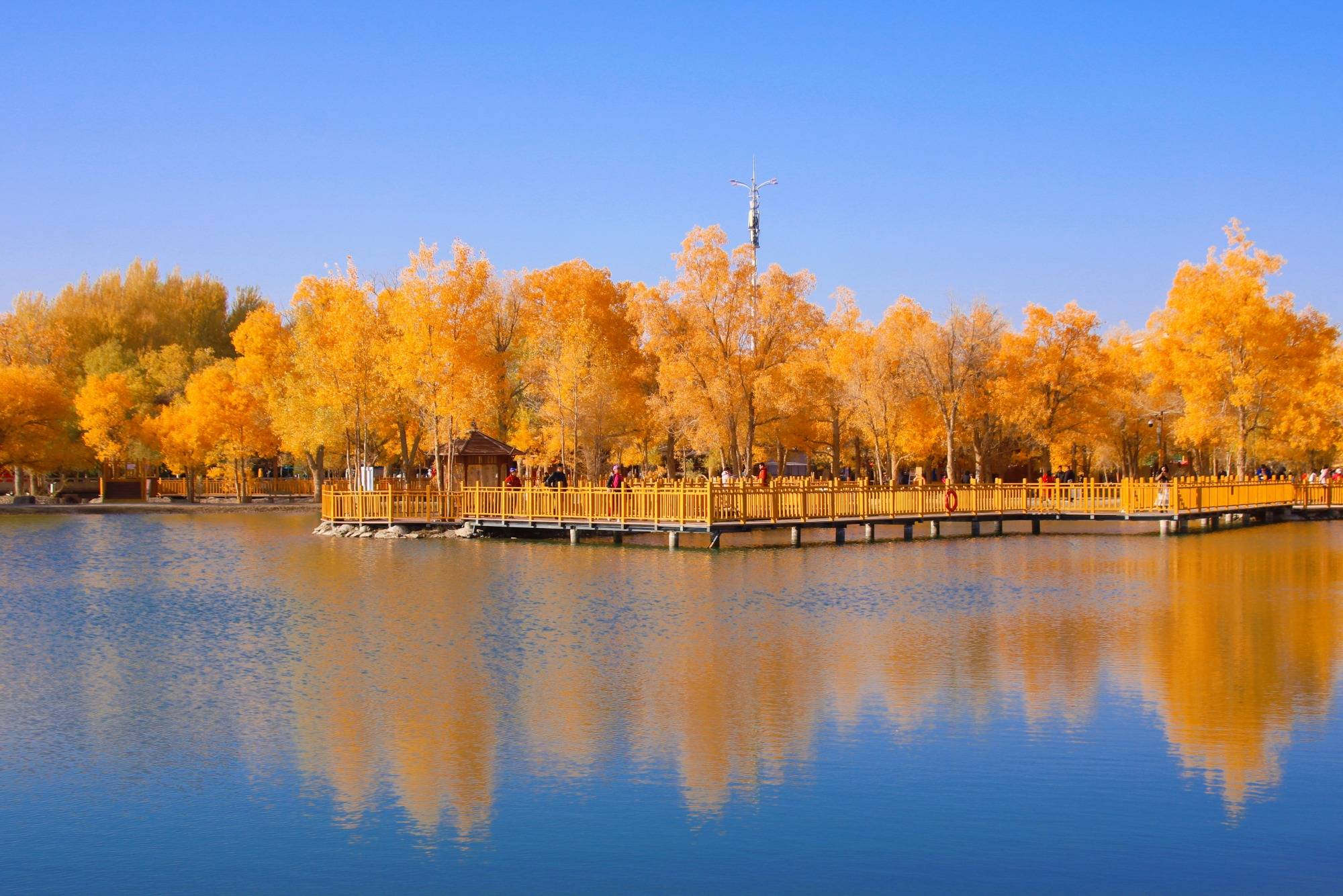 林间栈道细心地设计成金黄色 ,和岸边的胡杨林遥相辉映,一起倒映水中,画出高高低低的金黄色,仿佛欢快的音符跃动在人们心间。