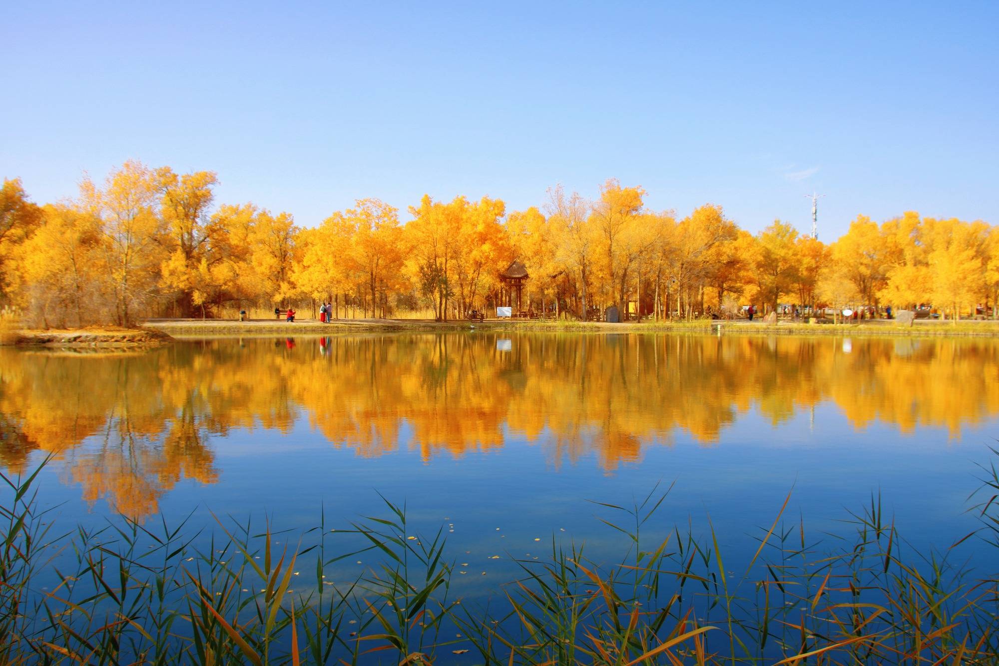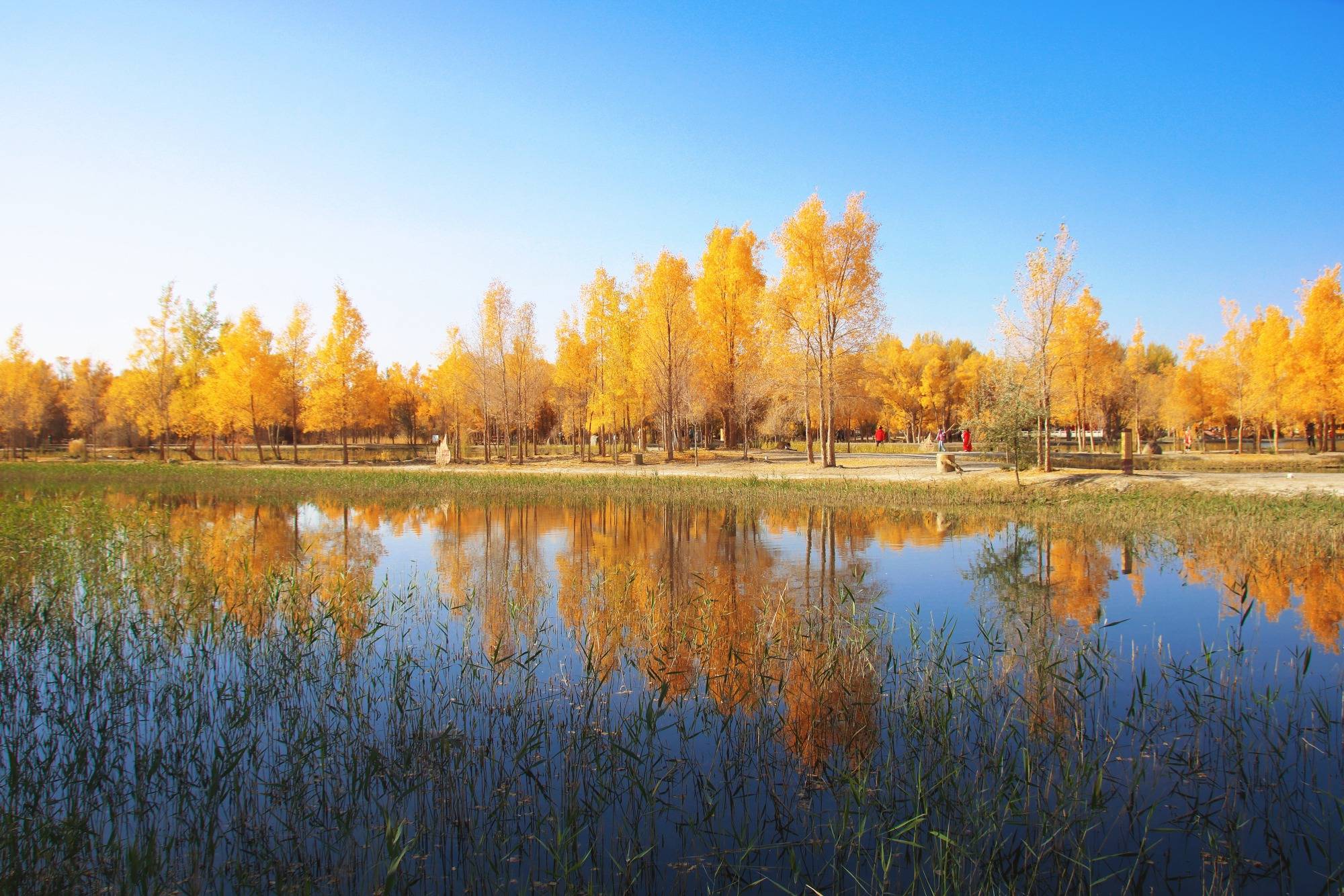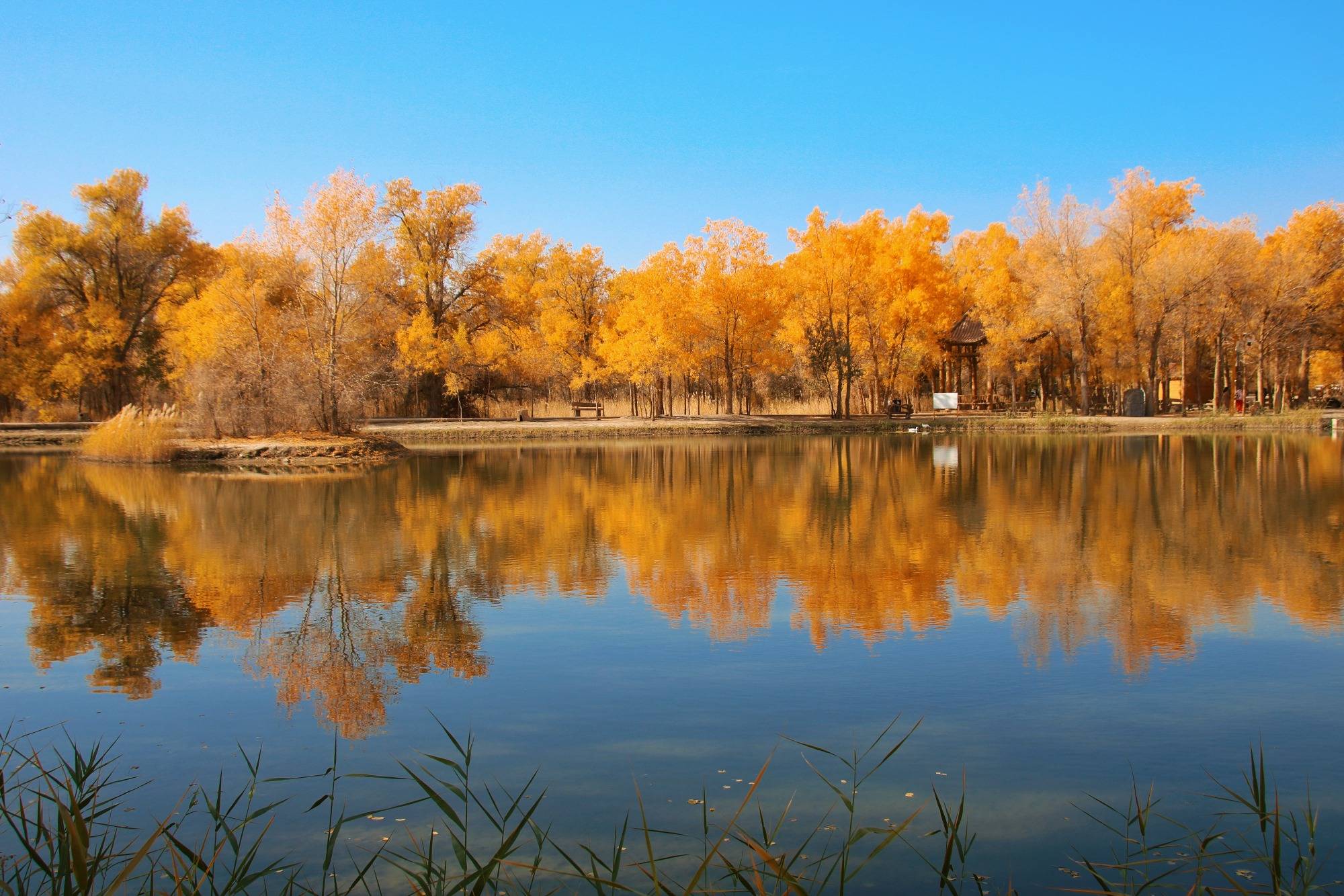 整片胡杨林中有大大小小的湖泊穿插其中,湖中芦苇让这里的景色多了几分野趣,从此岸望向彼岸,胡杨的迷人身影和纤细的芦苇在视线中交汇,前景、中景、远景,构成层次丰富的秋日画卷。