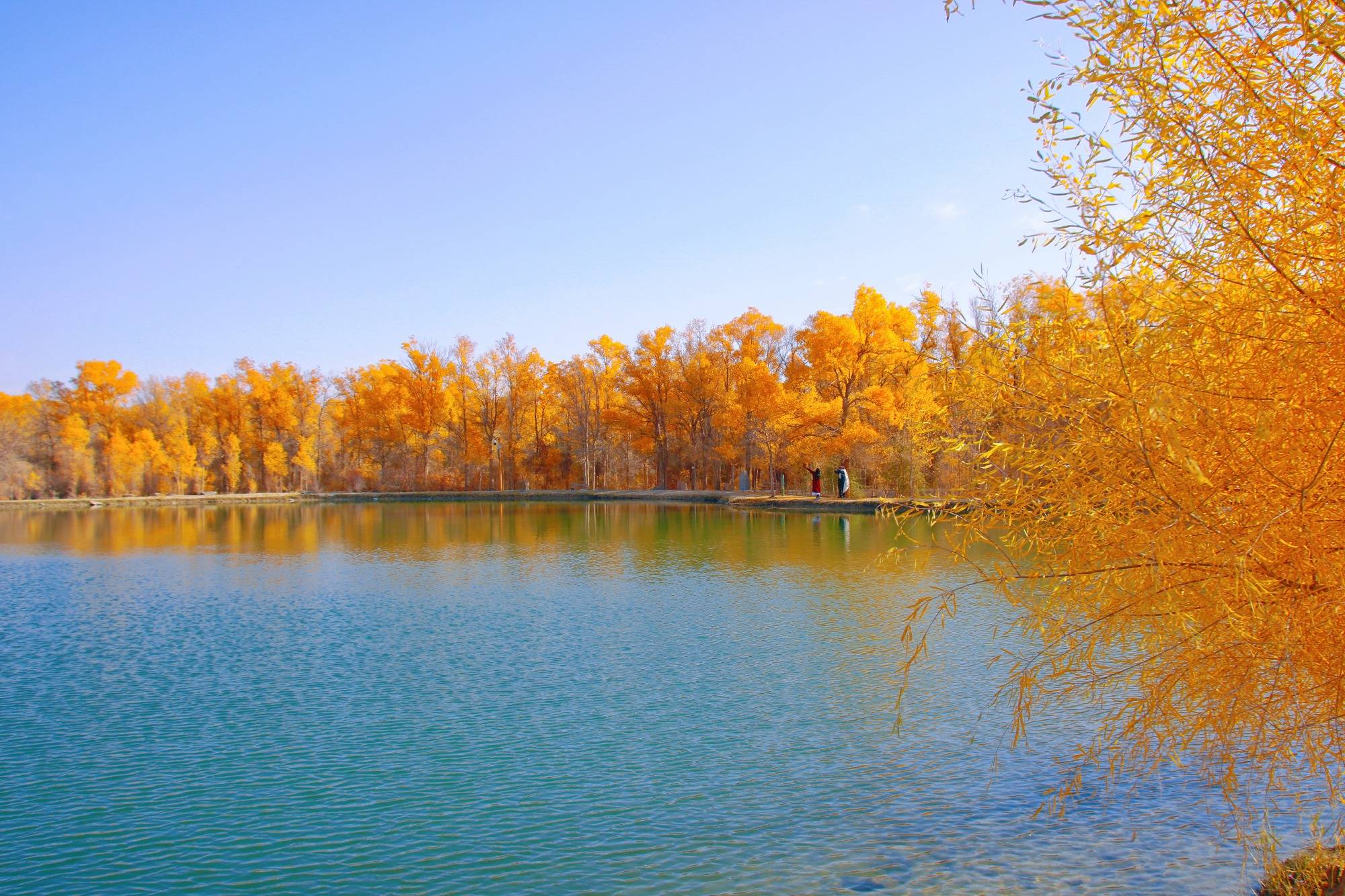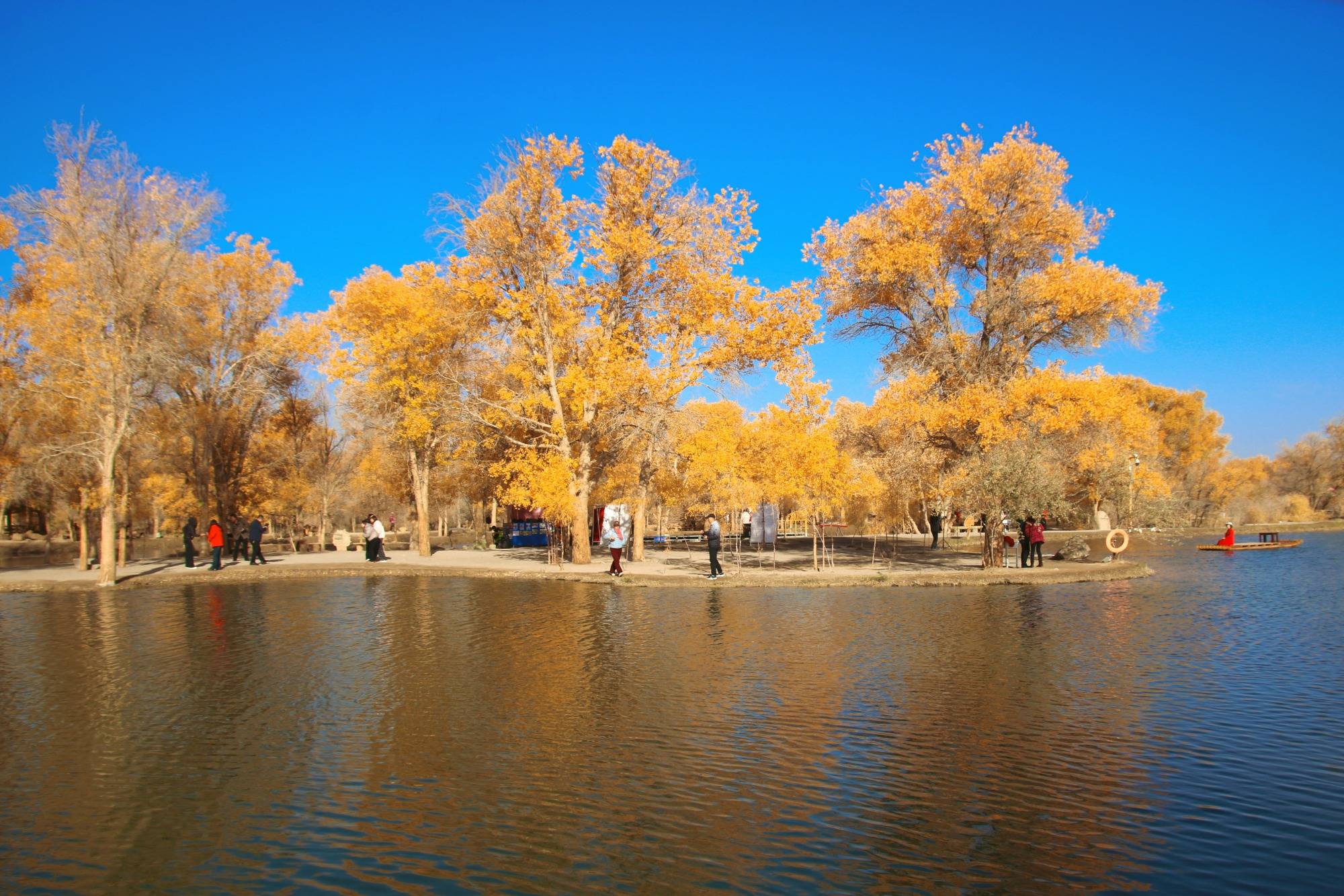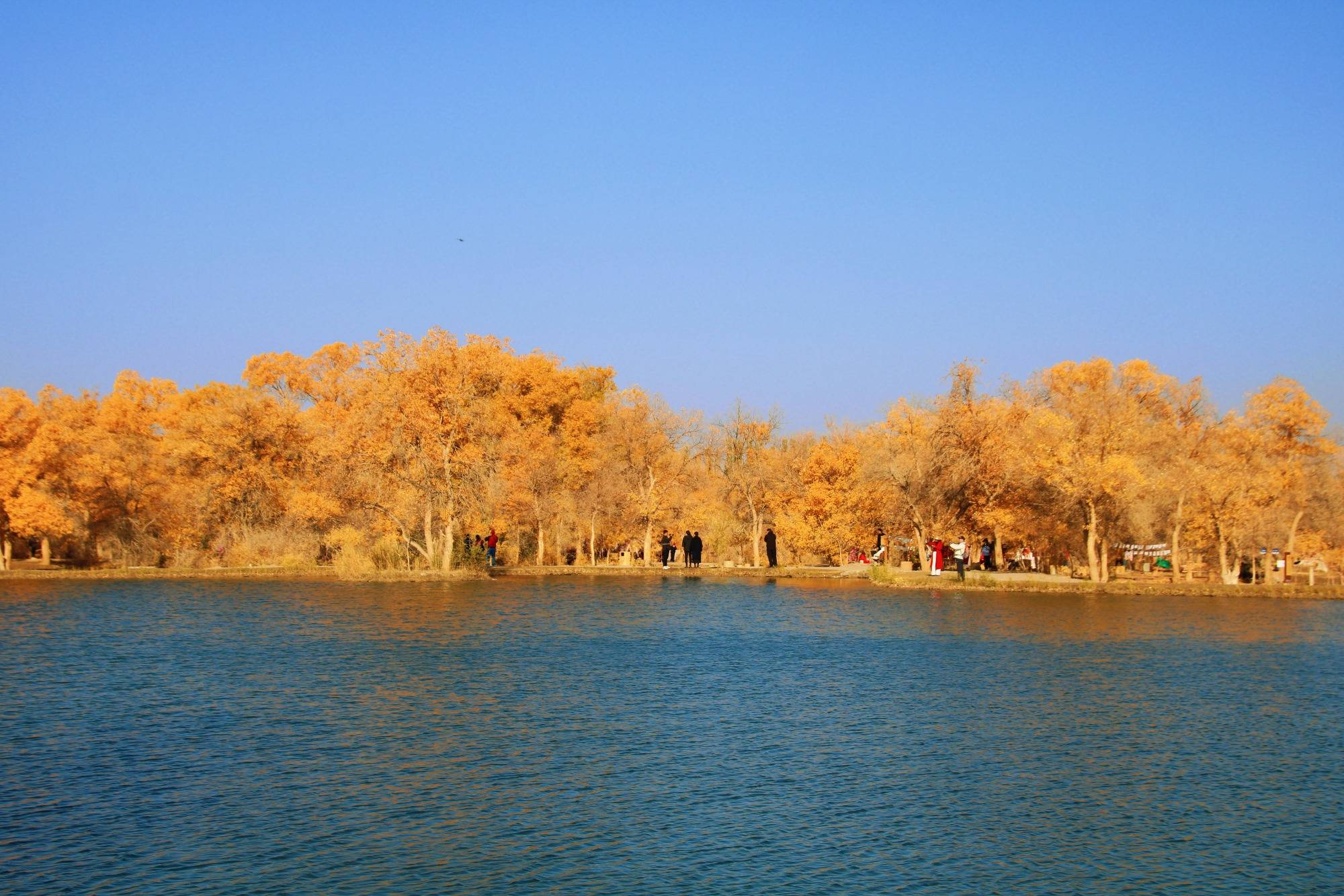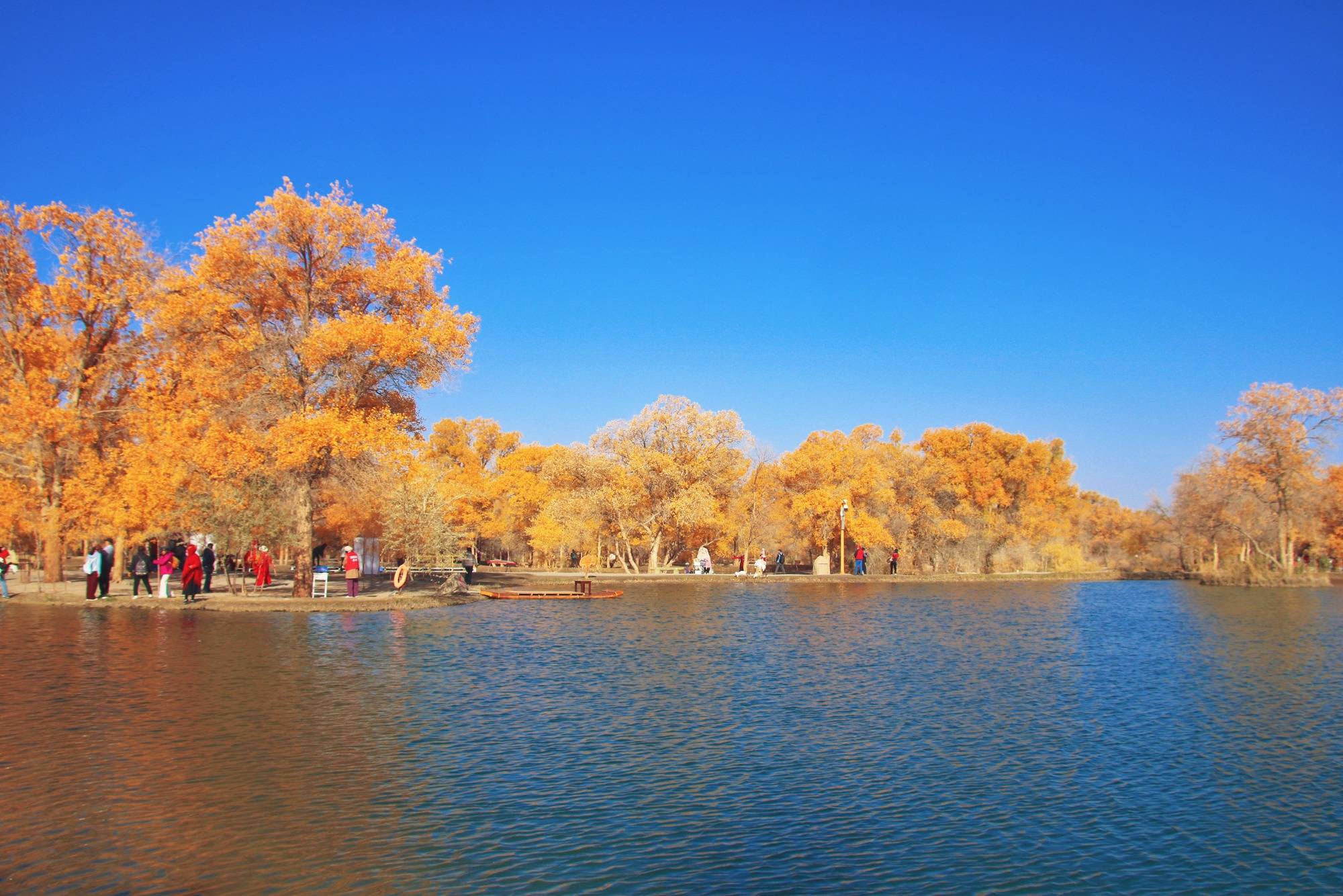 沿湖边漫步,清新的空气中带着清冽的味道,阳光像个调皮的孩子,在胡杨树叶上跳跃,金光闪闪迷乱了人们的眼。