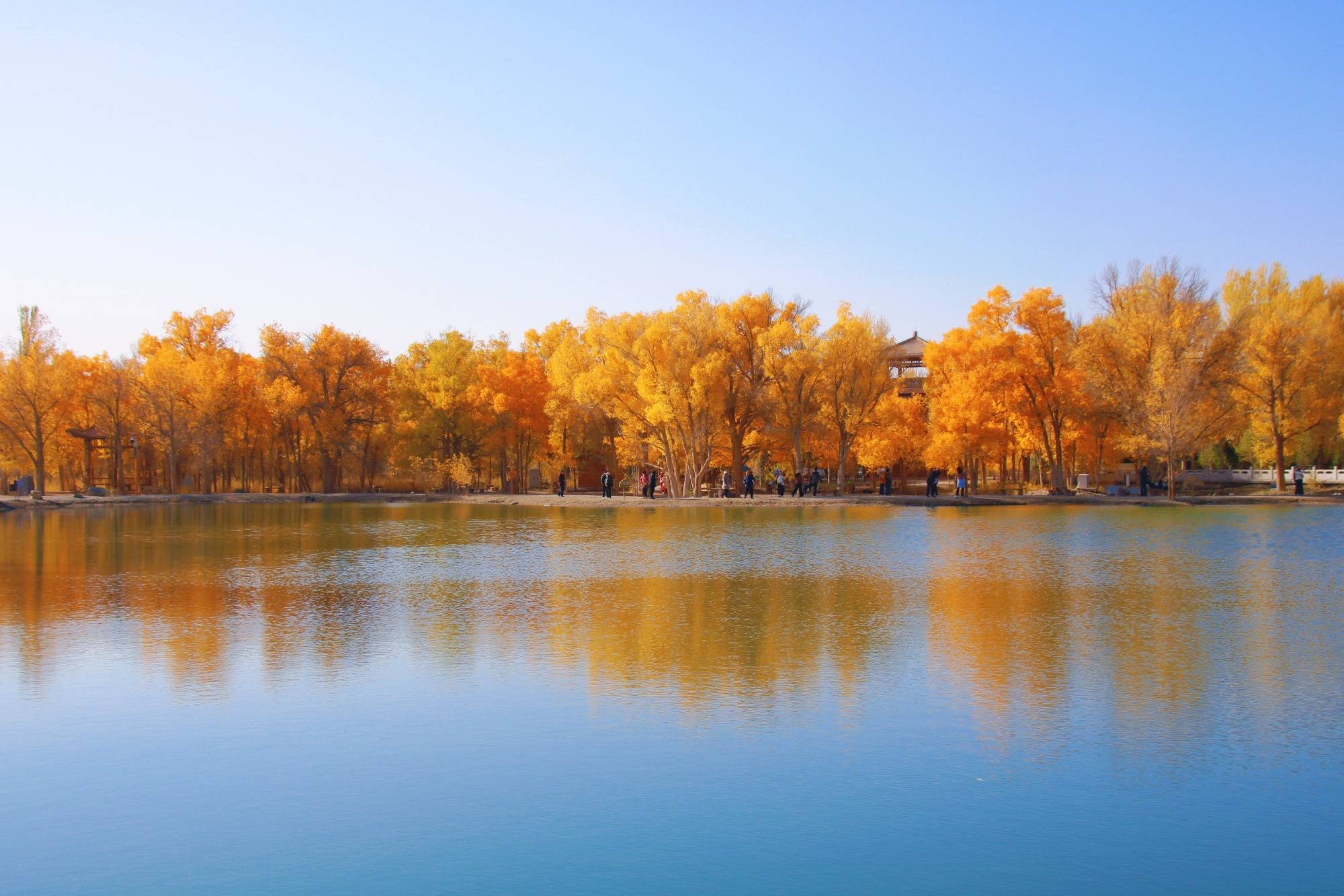 秋风吹走夏天的暑气,碧蓝天空下,胡杨树成片成林,风吹过,湖面泛起粼粼波光,树叶闪着金光,高大坚韧的胡杨树竟让人想用“摇曳生姿”这样柔美的词来形容。