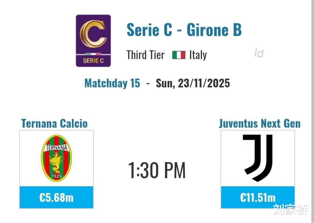 11月23日晚,意丙联赛第15轮将进行一场重要比赛,尤文二队客场挑战特尔纳纳,从实时积分看,特尔纳纳5胜6平3负积21分暂时排名B组第9,而尤文二队少赛一场5胜2平6负积17分暂居B组第12,若能战胜对手,将进一步缩小双方的积分差距。