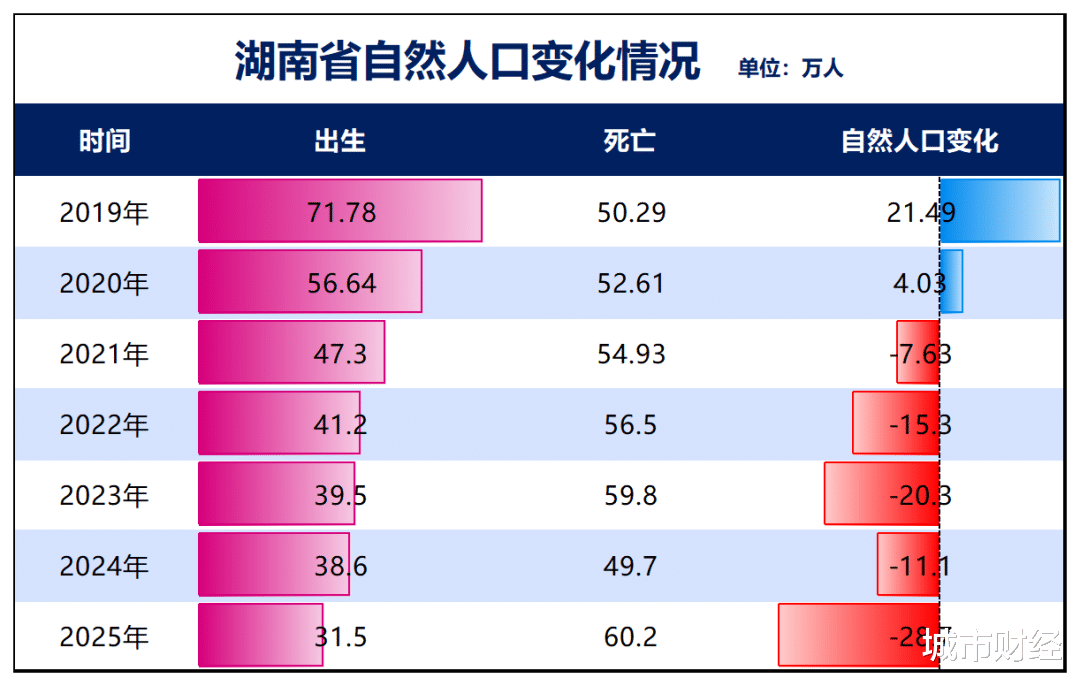 2025年湖南出生人口只有31.5万人,较2019年腰斩,同年死亡人口增加至60.2万人,自然人口减少了28.7万人。