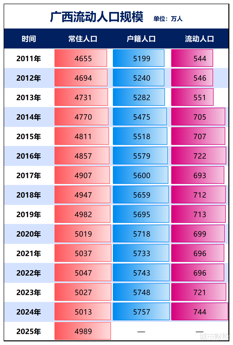 02 | 广西,常住人口跌破5000万在人口净流出全国第一的大背景下,2025年广西常住人口规模跌至4989万人,真是跌破5000万。