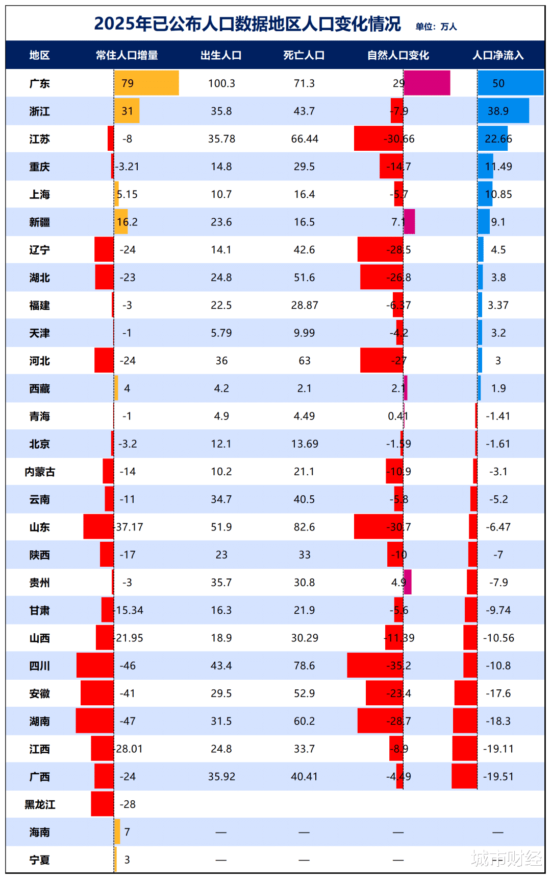 2025年各地区常住人口数据,目前仅差河南、吉林两省尚未公布数据。
