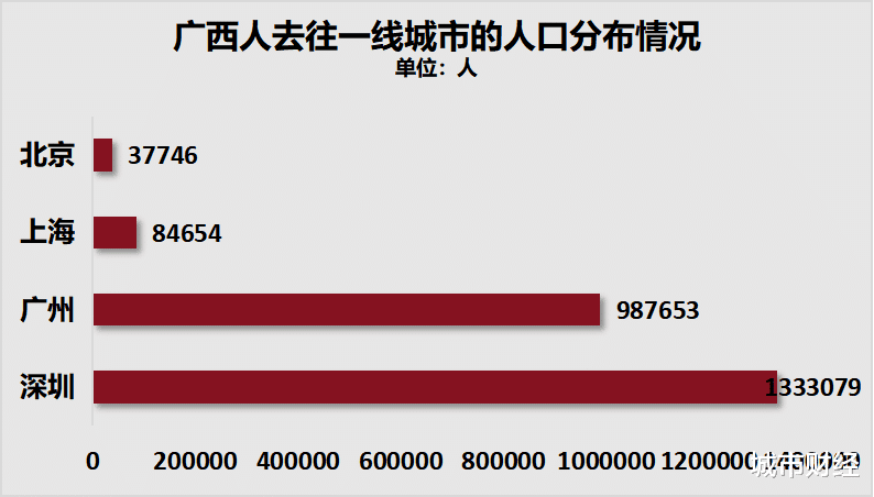 七普数据显示,广西去往上海的人口有8.47万,去北京的规模有3.77万,但这点规模只是去往广东规模的零头而已。