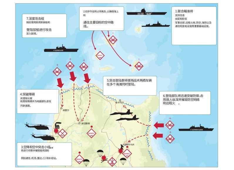 在“联合登陆战役”的版块中,美国陆军脑洞大开地认为解放军可能会从巴士海峡对菲律宾吕宋岛北部发起登陆作战,具体措施包括寻求占领外围岛屿;对敌军营、指挥部、火力及通信和发电设施发起打击;在航母福建舰和075型两栖攻击舰掩护下开展两栖登陆行动,并部署空中突击小组和空降兵占领或破坏内陆重要目标。