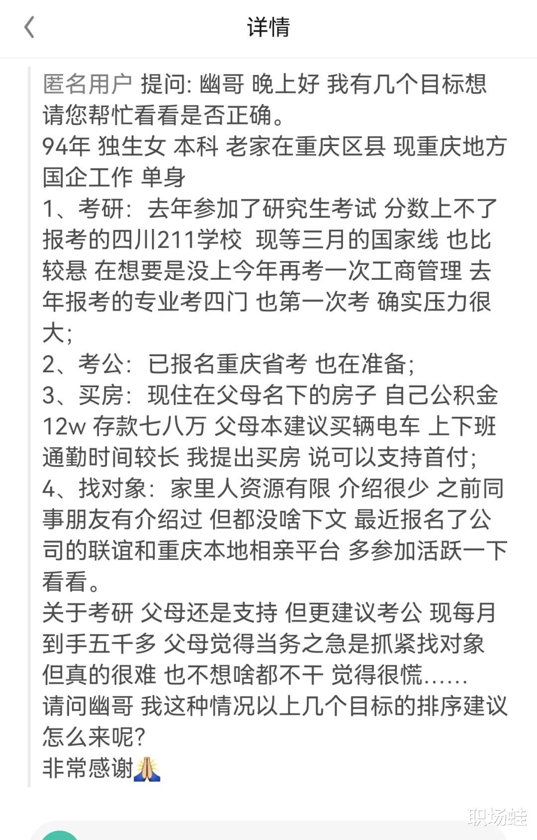 其实已经说过了,排序如下:【1】找对象>【2】买车>【3】考公>【4】买房>【5】考研。