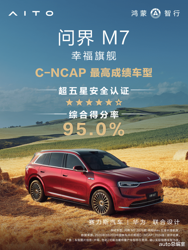 3月20日,中汽中心汽车测评管理中心(简称“中汽测评”)正式公布最新C-NCAP测试结果。“国民SUV幸福旗舰” 问界M7以95%的综合得分率荣获C-NCAP(2024版)超五星安全认证,成为C-NCAP(2024版)最高成绩车型,彰显出卓越的安全性能。