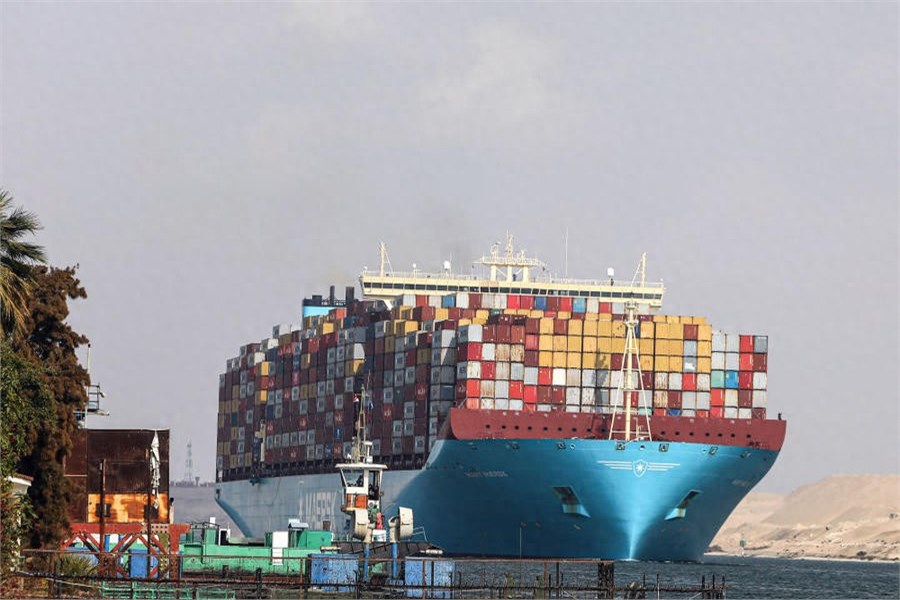 2024年1月13日,在埃及伊斯梅利亚省,一艘货轮行驶在苏伊士运河上。新华社发