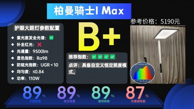 护眼大路灯第九名:柏曼骑士I Max;具备自定义恒定照度模式。