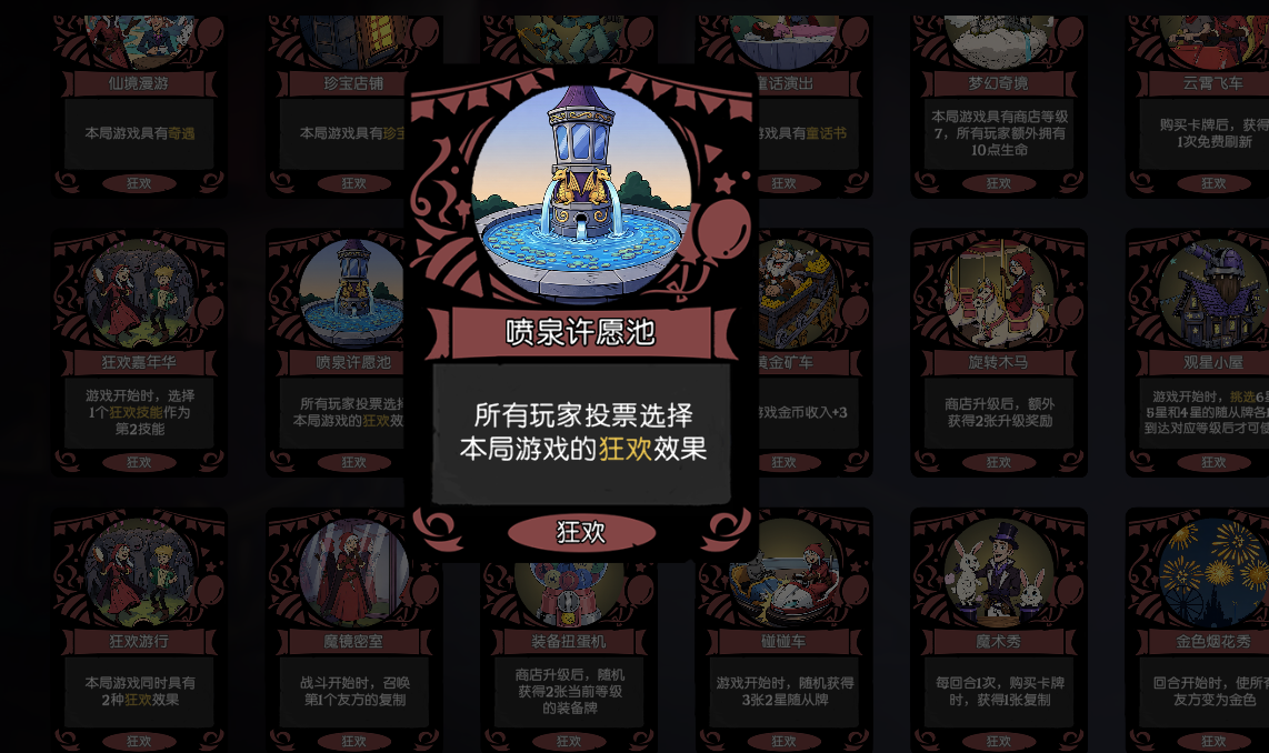 如果说“喷泉许愿池”是民主的狂欢,那“狂欢游行”就是叠加的惊喜。该效果能让本局游戏同时具备两种狂欢效果。千万不要小看这种“1+1”的组合,某些狂欢效果叠加在一起时,会产生神奇的化学反应,让原本平淡的对局瞬间变得“混乱”而有趣,强度与节目效果双双爆表。