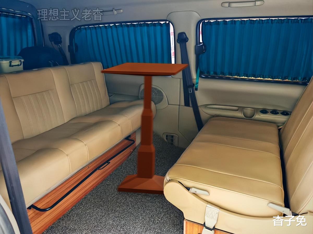 打开中门,车内软垫铺地,中后排座椅换成了床车专用椅,中排座椅已向后翻转,与后排形成对座,中间添置了一张升降桌,组成车载小客厅,是日常喝茶吃饭与学习办公的地方。