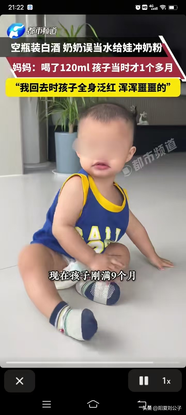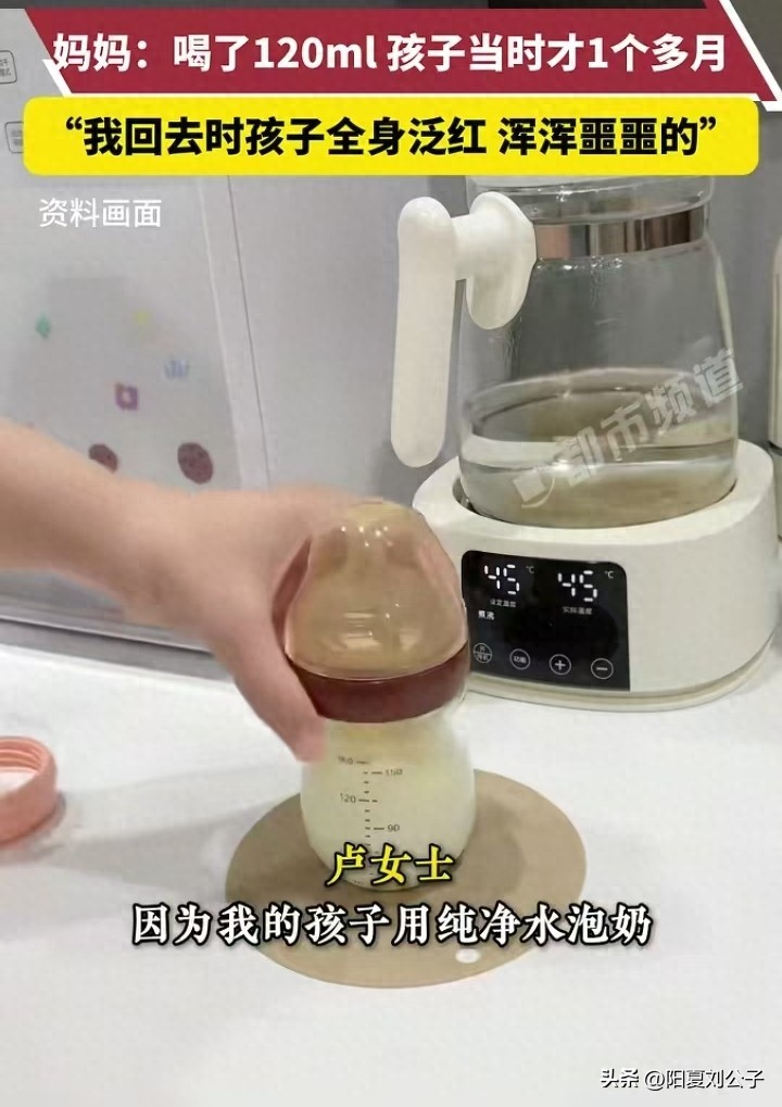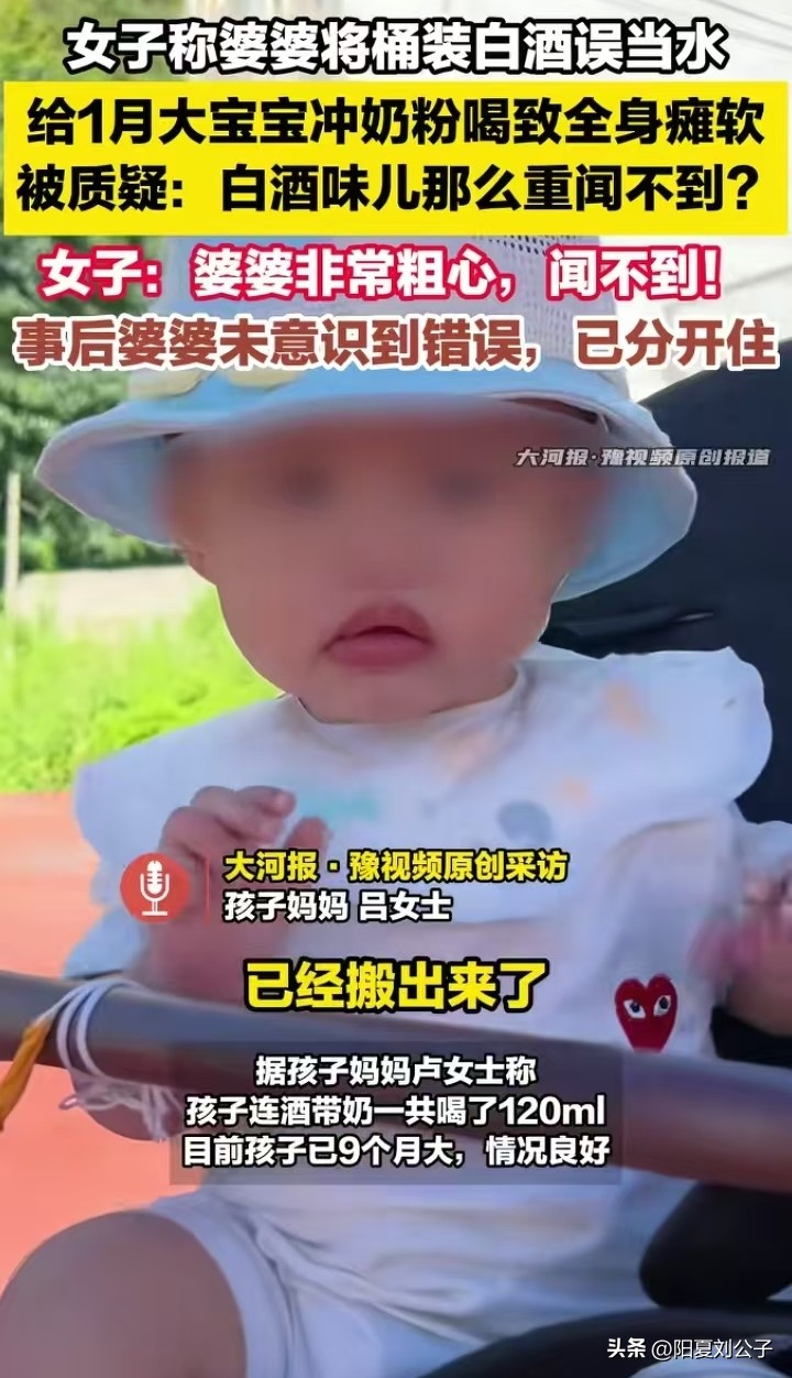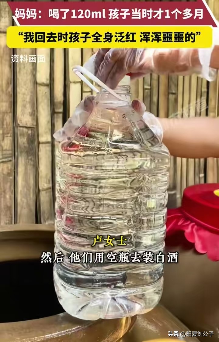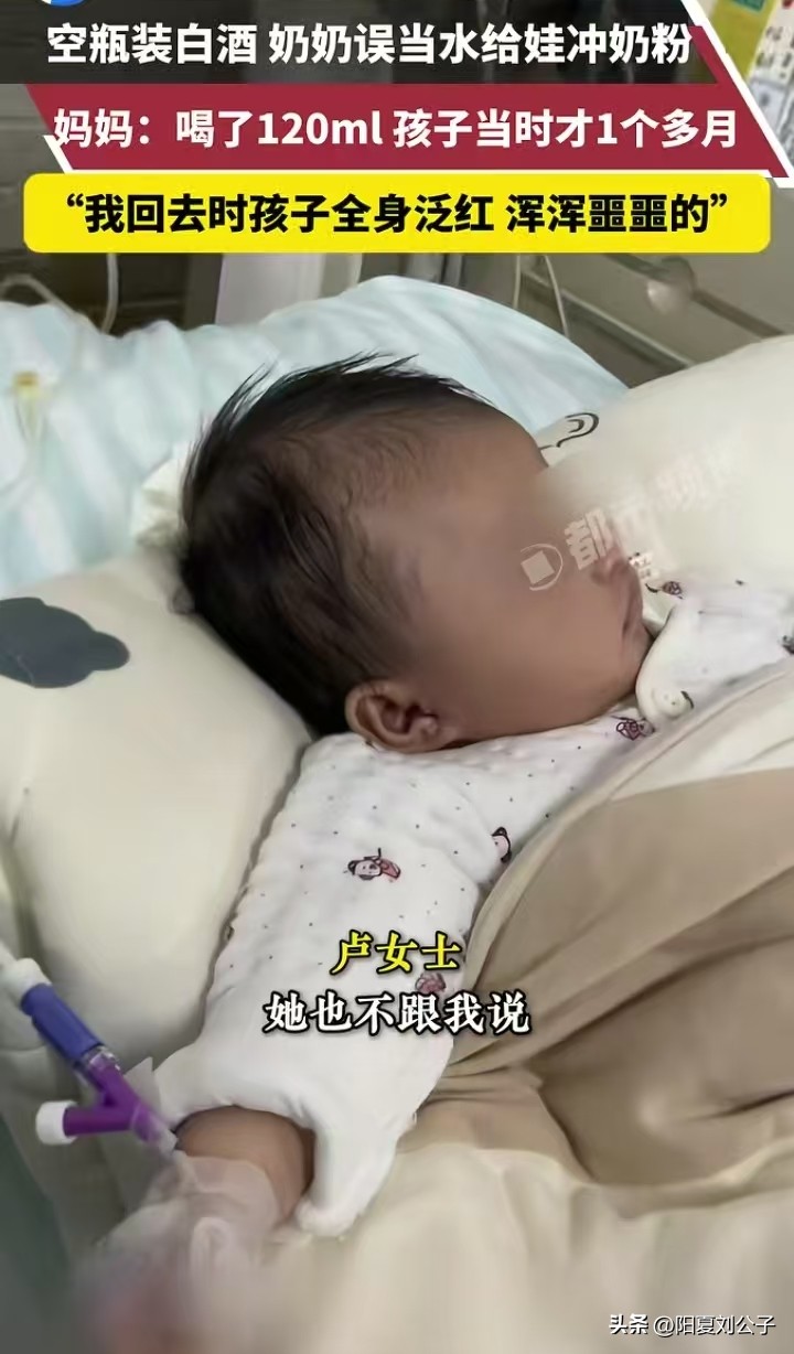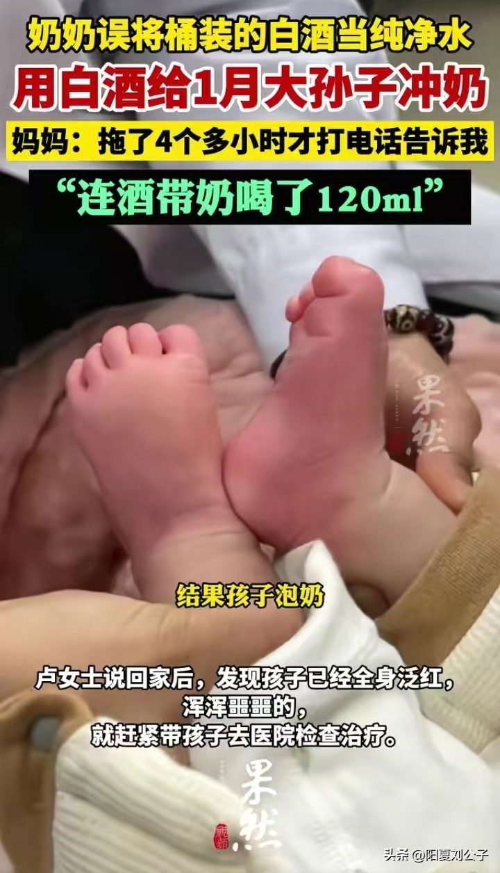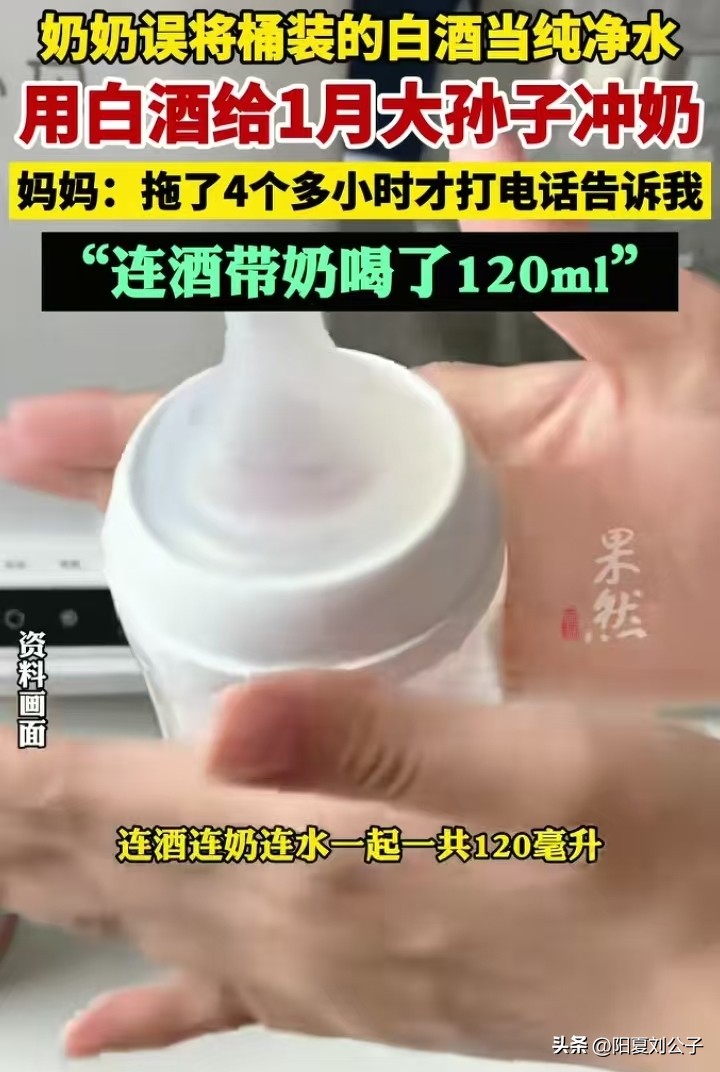 事情就坏在“冲奶要用纯净水”上,粗心大意的奶奶直接提起装有白酒的纯净水桶,将白酒误以为是水倒进了奶瓶里。严格按照媳妇的嘱咐冲了120克,加热后连酒带奶喂给了自己的大孙子。