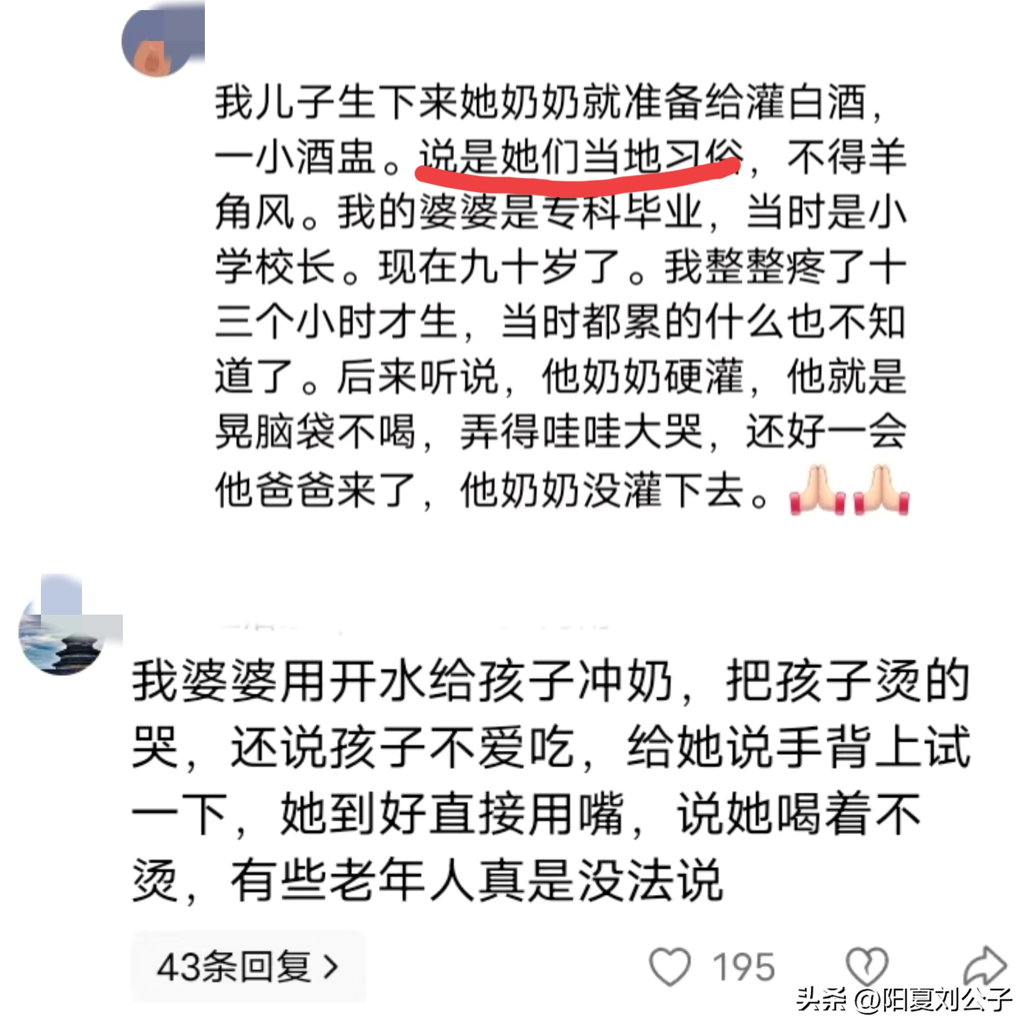 也有网友给出了不同的意见,认为这就是老人带孩子的方式,有的地方就有在孩子出生不久后给孩子喂酒的习俗,感觉对孩子不好就拒绝了。