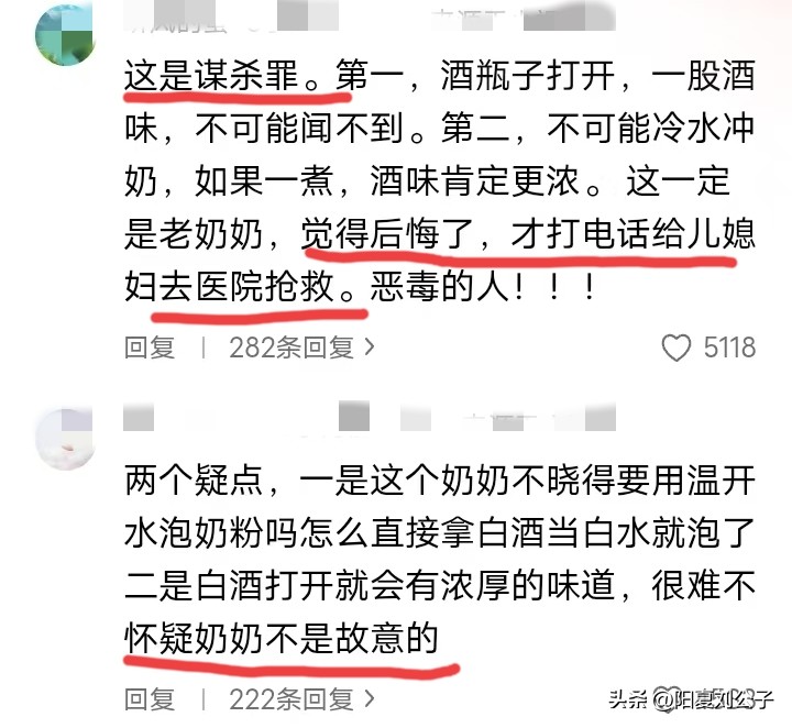 有网友质疑孩子奶奶的动机:“散装白酒味道很大,用热水加热后味道会更冲,怎么会闻不到?除非是故意的”。
