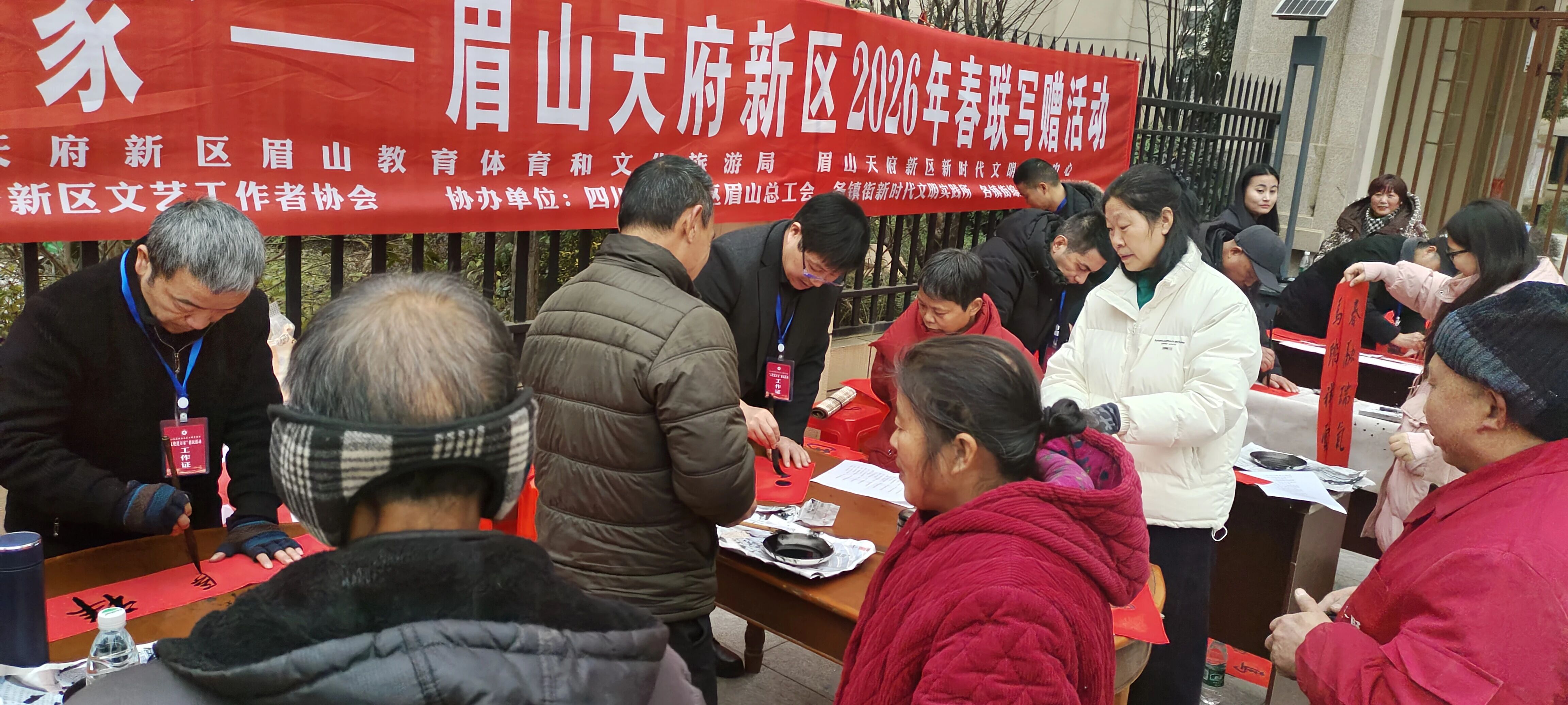衔岷水灵气,漾锦江雅韵。2026年1月28日,由四川天府新区眉山教育体育和文化旅游局、眉山天府新区融媒体中心、眉山天府新区新时代文明实践中心联合主办,眉山天府新区文艺工作者协会承办,四川天府新区眉山总工会、各镇(街道)新时代文明实践所及综合文化站(分站)协办的眉山天府新区“文化进万家”2026年春联写赠活动第七站,与眉山华夏书画艺术研究院指导,眉山市硬笔书法家协会、眉山天府新区融媒体中心、眉山天府新区文艺工作者协会联合主办的“首届中华优秀传统家风家训硬笔书法艺术作品巡回展”第七站,双双走进眉山天府新区锦江镇锦江社区居民住宅区,共谱一曲文化惠民的暖韵和弦。