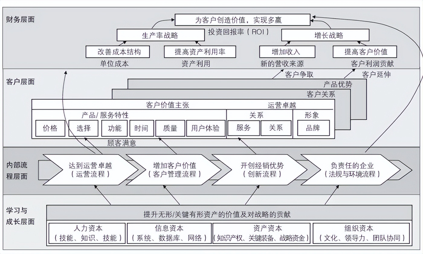 该层面描述了企业战略要实现的财务目标,其结果指标是实现股东价值、提高投资回报率。对应的驱动战略和指标包含两个方向:其一是通过改善成本结构和提高资产利用率,实现提升生产率的战略;其二是通过实现客户价值和增加收入,实现企业的增长战略。
