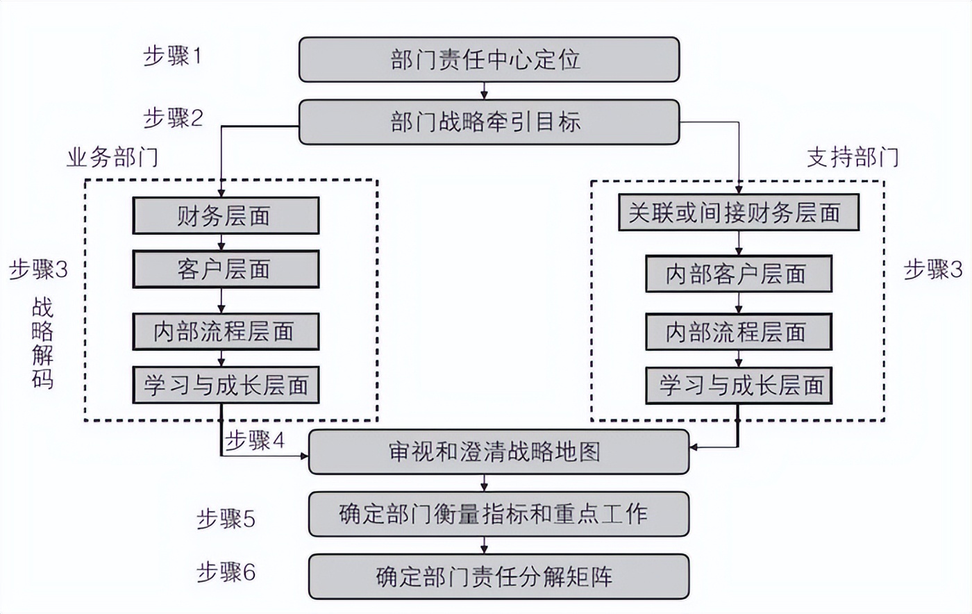 战略解码的主要步骤如图6 所示,业务部门和支持部门略微有些差异,特别是在财务层面和客户层面,分为以下六个步骤。