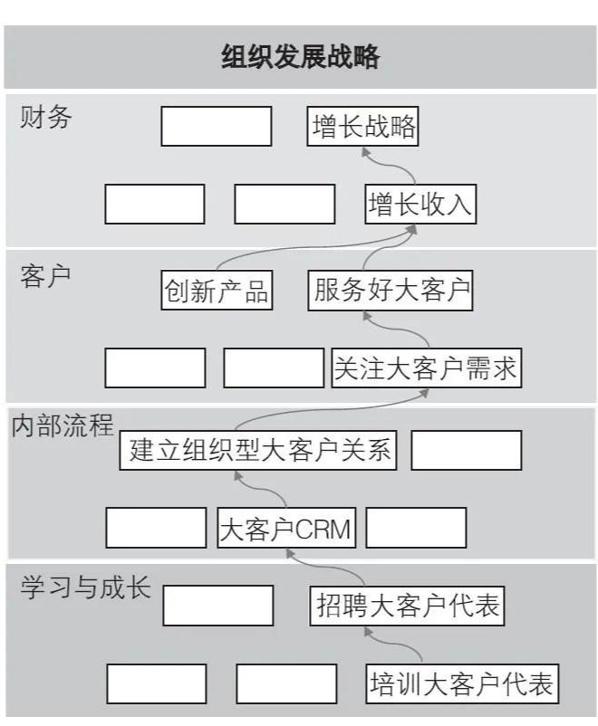 BSC 战略解码最核心的思想是要建立各战略层面解码的逻辑关系。以大客户战略为例,图5 对战略解码的过程进行了详细说明。大客户战略属于企业增长战略的重要组成部分。企业拥有的高价值大客户越多,企业的业务收入和增长就越具有可持续性和稳定性。为达到该财务目标,必须关注大客户需求,并通过提供创新的产品和解决方案来落实。为全面理解客户需求和客户中长期发展战略,从而更好地服务好大客户,必须建立大客户关系管理流程和IT 系统,与大客户建立稳固的组织型客户关系。为此,必须有合格的大客户经理,以及适于大客户拓展的“一线铁三角”营销组织和快速响应一线需求的平台支撑组织体系。这四个层面一环扣一环,具有很强的逻辑关系。