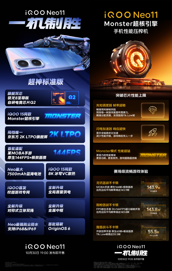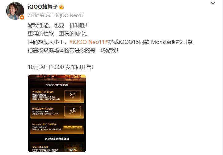 “超神标准版,一机制胜!行业唯一2K屏+7500mAh性能旗舰!同时搭载iQOO15同款Monster超核引擎、同款8K VC散热、Neo全新升级金属中框、IP68&69……史上最强iQOO Neo,#iQOO Neo11#!”随后, @iQOO慧慧子 也发文称,“游戏性能,也要一机制胜!更猛的性能,更稳的帧率。性能旗舰大小王,#iQOO Neo11#搭载iQOO15同款 Monster超核引擎,把赛场级流畅体验带进你的每一场游戏!”