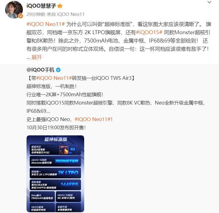 @iQOO慧慧子 还转发了官宣海报,并补充称,“#iQOO Neo11# 为什么可以叫做“超神标准版”,看这张图大家应该很清晰了。旗舰双芯,同档唯一京东方 2K LTPO旗舰屏,还有#iQOO15# 同款Monster超核引擎和8K散热!除此之外,7500mAh电池、金属中框、IP68&69等全部给到!还有很多用户在问的对称式立体双扬。自信说一句:这一杯同档应该很难有敌手了!当然,其他惊喜我们10月30日再细聊!”