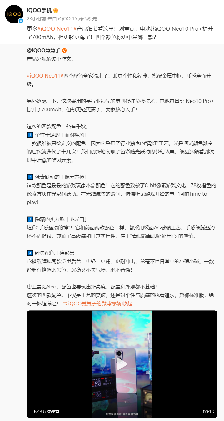 @iQOO手机 官博转发了这条微博,并总结了其中的亮点,“更多#iQOO Neo11#产品细节看这里!划重点:电池比iQOO Neo10 Pro+提升了700mAh,但更轻更薄了!四个颜色你更中意哪一款?”