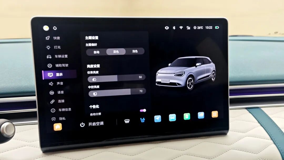 系统支持全场景AI语音交互并新增了深色主题,可随GPS时间自动在深浅之间切换,满足了夜间驾车的护眼需求。首页场景中的时钟、个性标签、音乐挂件等模块都可进行自定义,还可在台灯处快捷调节氛围灯(2026款车型升级了多色律动氛围灯)、在抽屉处收藏常用应用、点击日历还可进入日历详情页,加上Dock栏6个自定义位置,新车的人机交互体验得到了大幅的提升。