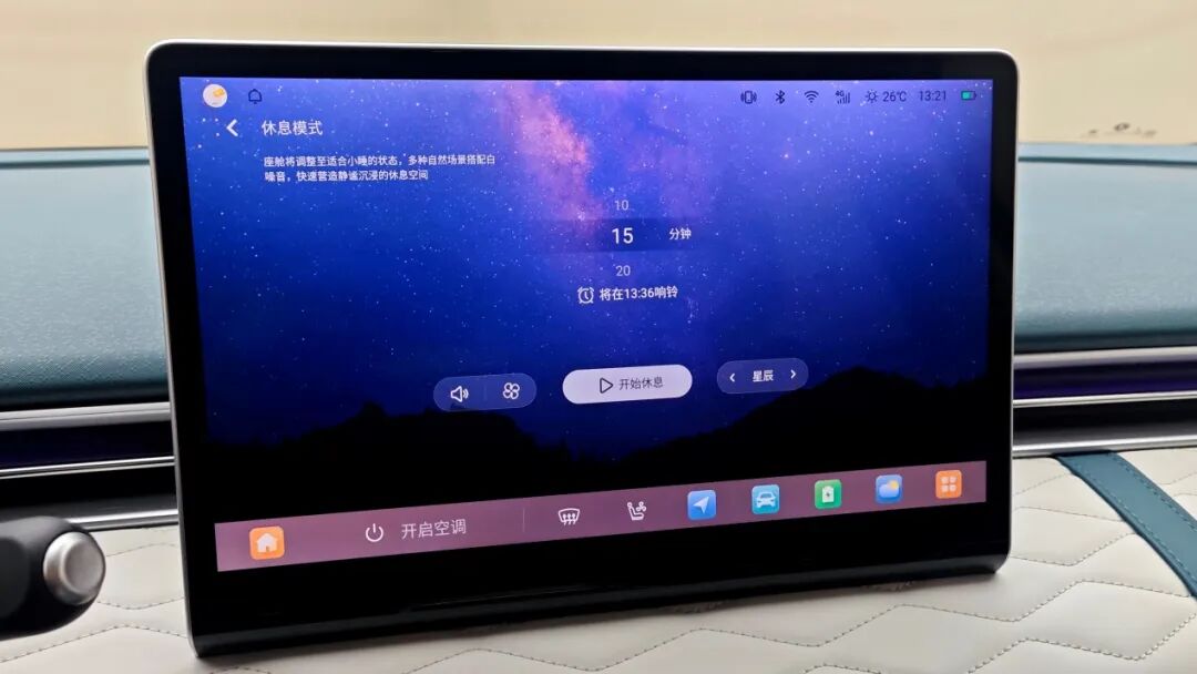 车机还内置了8种悦享情景模式,包含呵护宝宝、一键降温、快速温暖、雨雪模式、停车模式、休息模式、临停模式(宠物模式)以及自定义模式,其中休息模式可一键联动7项功能,它可将主驾座椅放平与后座连成一张半躺大床,并配合多种白噪音快速营造静谧沉浸的休息空间,还有闹钟功能可以设定唤醒时间,极为周到。