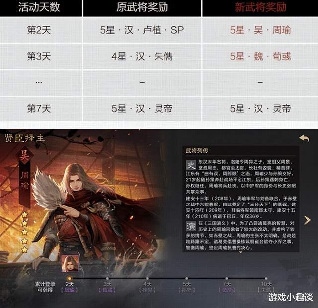 就算没有足够的运气也是不用担心的,因为游戏直接给出了10天的五星武将免费拿活动,其中包括周瑜、荀彧和灵帝在内的武将,都是各自阵营中的核心,组成T0和T1也是手拿把掐。