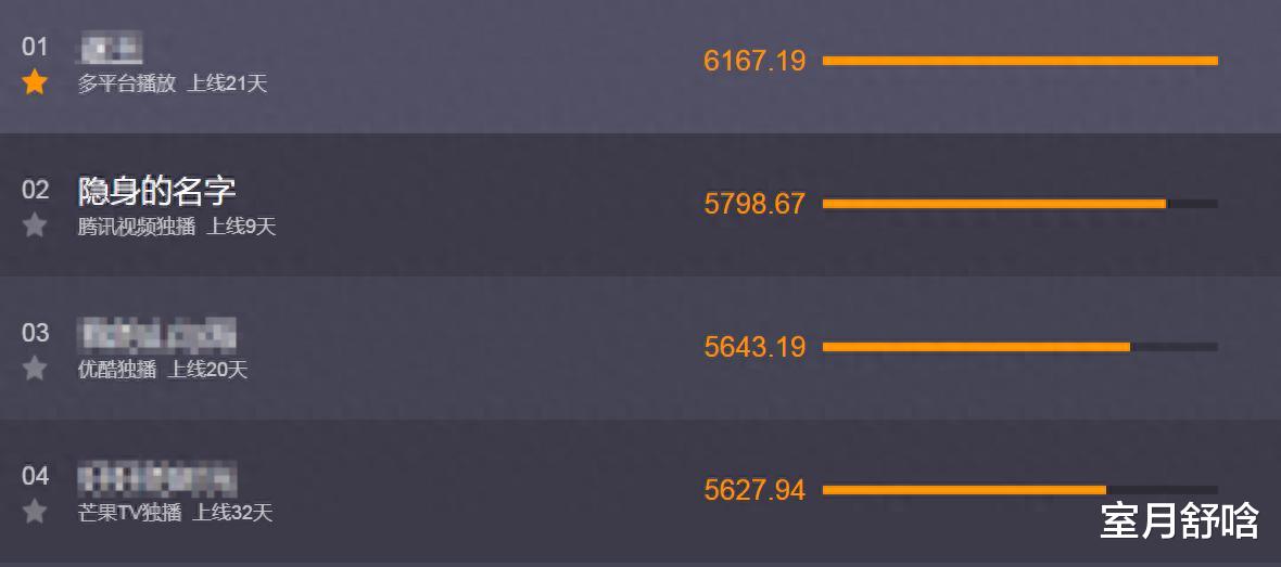 《隐身的名字》上线九天,成功霸榜猫眼专业版网播热度第二,成绩可喜可贺,饰演主要角色的演员们也收获了热度,他们用细腻的演技向观众展示了角色的维度和灵魂。