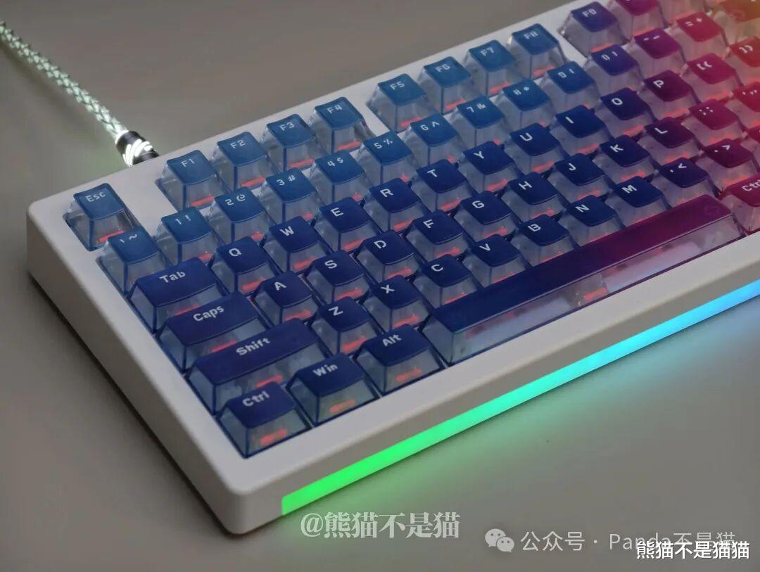 琉璃樽采用了一套从深蓝到浅黄的渐变透明键帽,因为是透明键帽所以用的是PC注塑,虽说比较容易打油,但透光性强,且颜色也更为鲜艳,同时PC键帽的敲击更带感,很空洞。