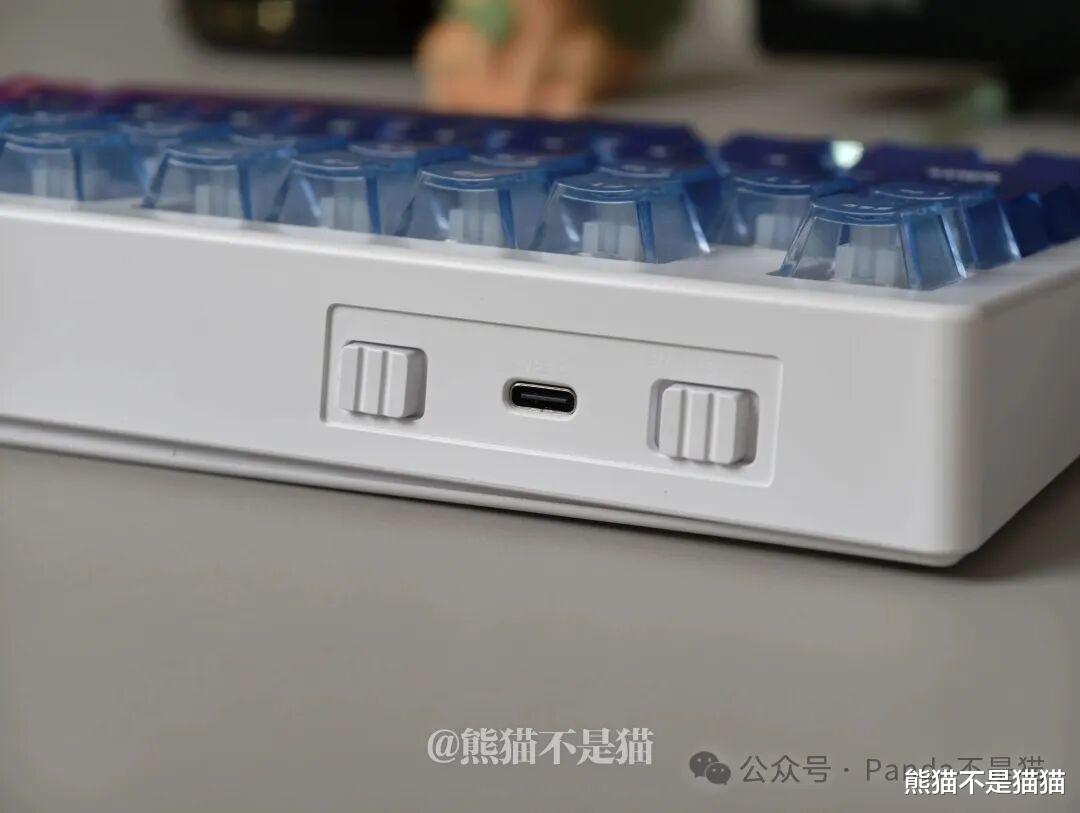 有线连接并没有居中,这一点个人并不是特别喜欢,但有些人就喜欢这种,具体还是得看每个人的适用环境。键盘支持双系统和多模,切换的波动杆也设置在这地方,因为顶部的抬起比较高,操作其实非常顺手。