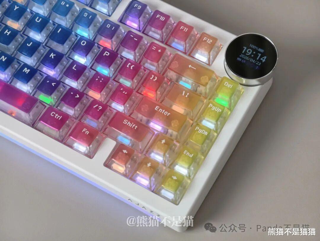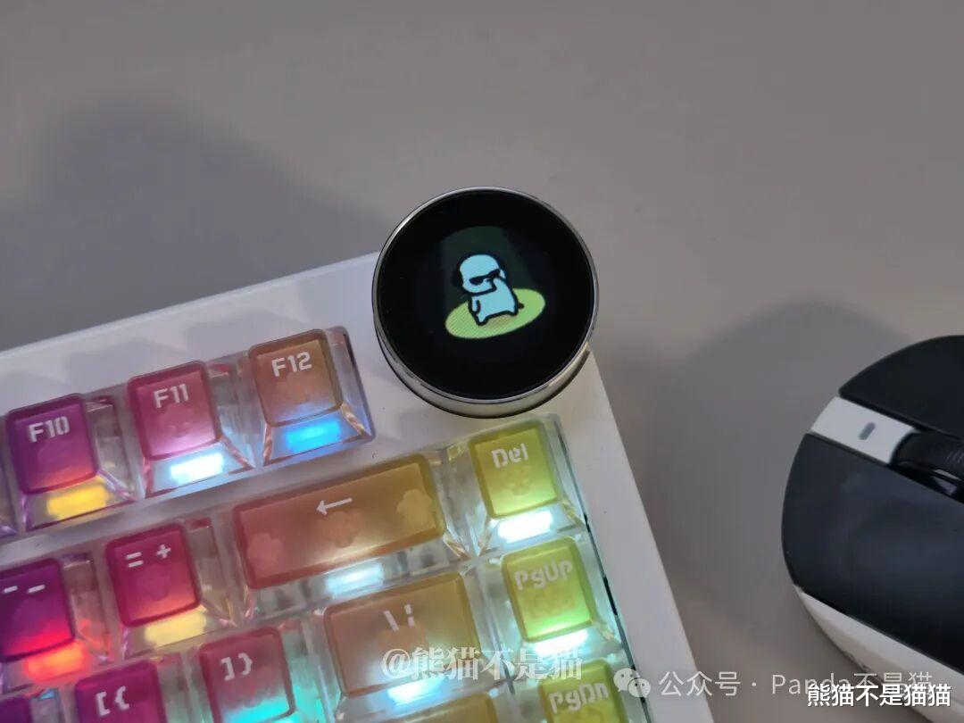 键盘采用81键+金属旋钮的布局,而金属旋钮除了能作为旋钮使用,也是一块圆形的0.9寸TFT显示屏,能提供键盘状态、键盘调节以及GIF动图等多种功能,除此之外通过有线驱动连接的情况下还支持查看CPU/GPU的使用了以及当前的天气情况。