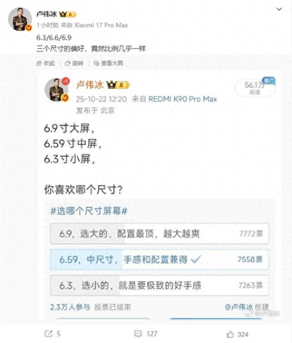 为了解消费者对不同屏幕尺寸的偏好,小米集团总裁卢伟冰发起了一项投票,吸引了2.3万人参与。令人意外的是,投票结果显示三种屏幕尺寸的得票数相当接近:6.9寸大屏以7772票暂时领先,6.59寸中屏获7558票紧随其后,6.3寸小屏则有7263票。卢伟冰对此感慨道:"6.3/6.6/6.9三个尺寸的偏好,竟然比例几乎一样"。