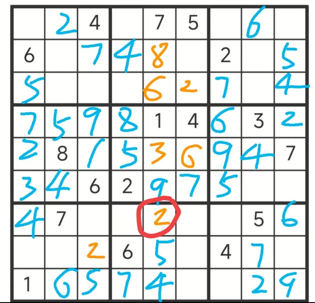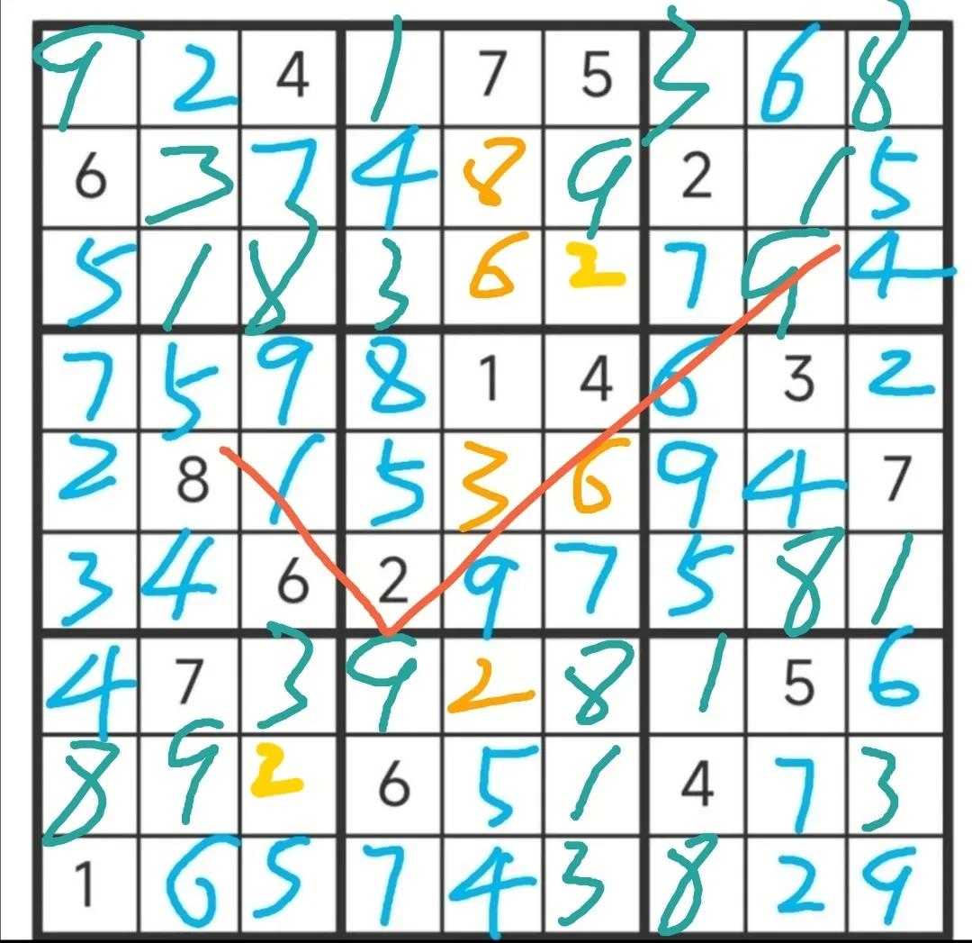 第一轮选这个第八宫第一行第二列的2,结果只是推出了几个数,就又推不下去了,果断放弃。