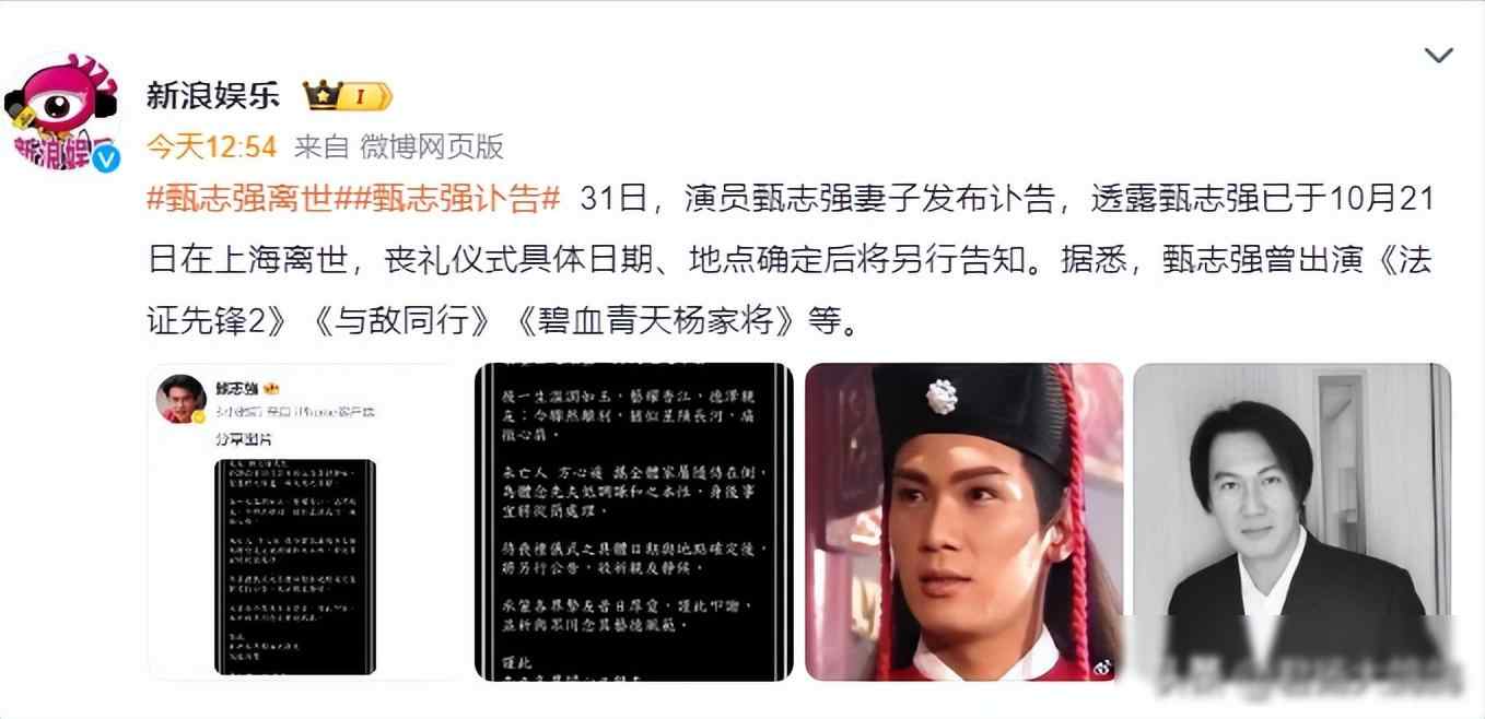 甄志强在十月二十号去世,消息拖到三十一号才传开,他那几天还在发布吃东西的视频,看着挺精神,完全没有生病的样子,五月份他住过一次院,当时拍视频说生命没有预警,现在看来像是临终前的提醒,甄志强因为演展昭出名,老港片观众都记得他,他这一走,加上许绍雄也刚离开,让人觉得港片那一代人真的快走光了,内地明星很少谈论健康问题,甄志强却敢说出来,只是说得太晚了。