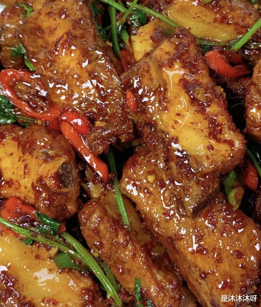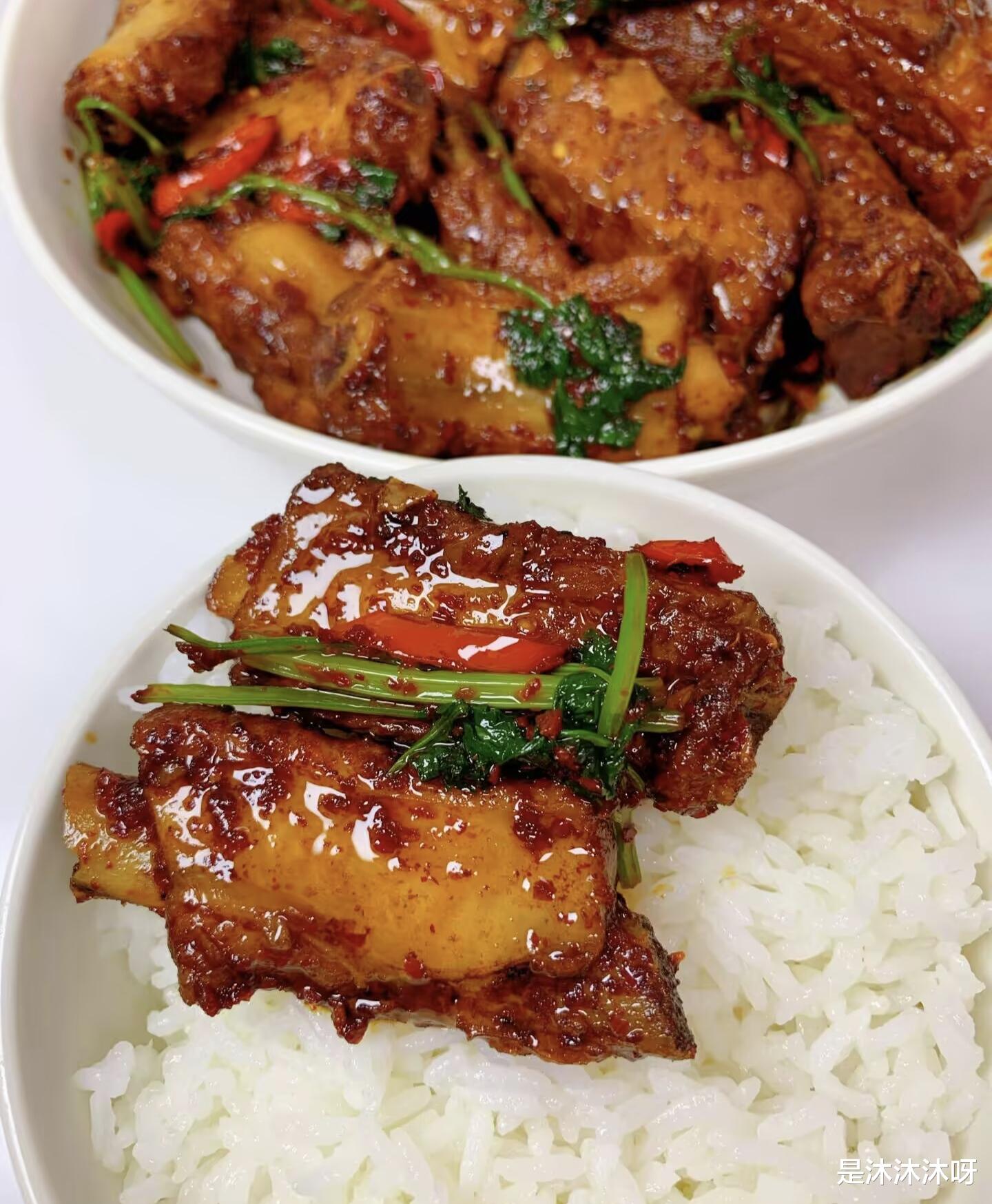 盛进盘子里,红亮的排骨上点缀着翠绿的葱花和鲜红的辣椒,光看着就让人食欲大开。夹一块送进嘴里,外层的酱汁咸鲜微辣,咬开肉质软烂脱骨,里面的骨髓都吸饱了辣油。