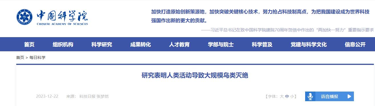 信息来源:中国科学院 研究表明人类活动导致大规模鸟类灭绝 2023-12-22