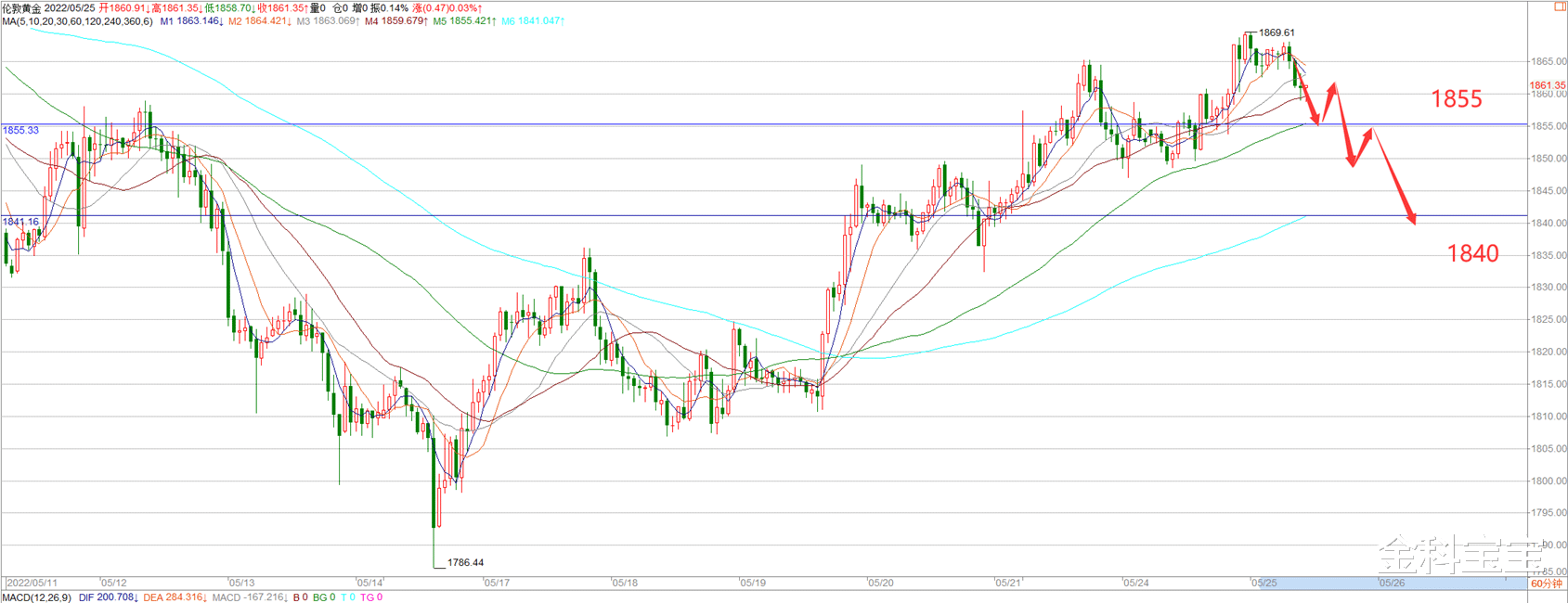 下方我们目前可以关注1855这里,这里是小时图ma60均线位置,如果能够跌ma60这里,那么接下来可能会继续触及ma120均线1840这里。