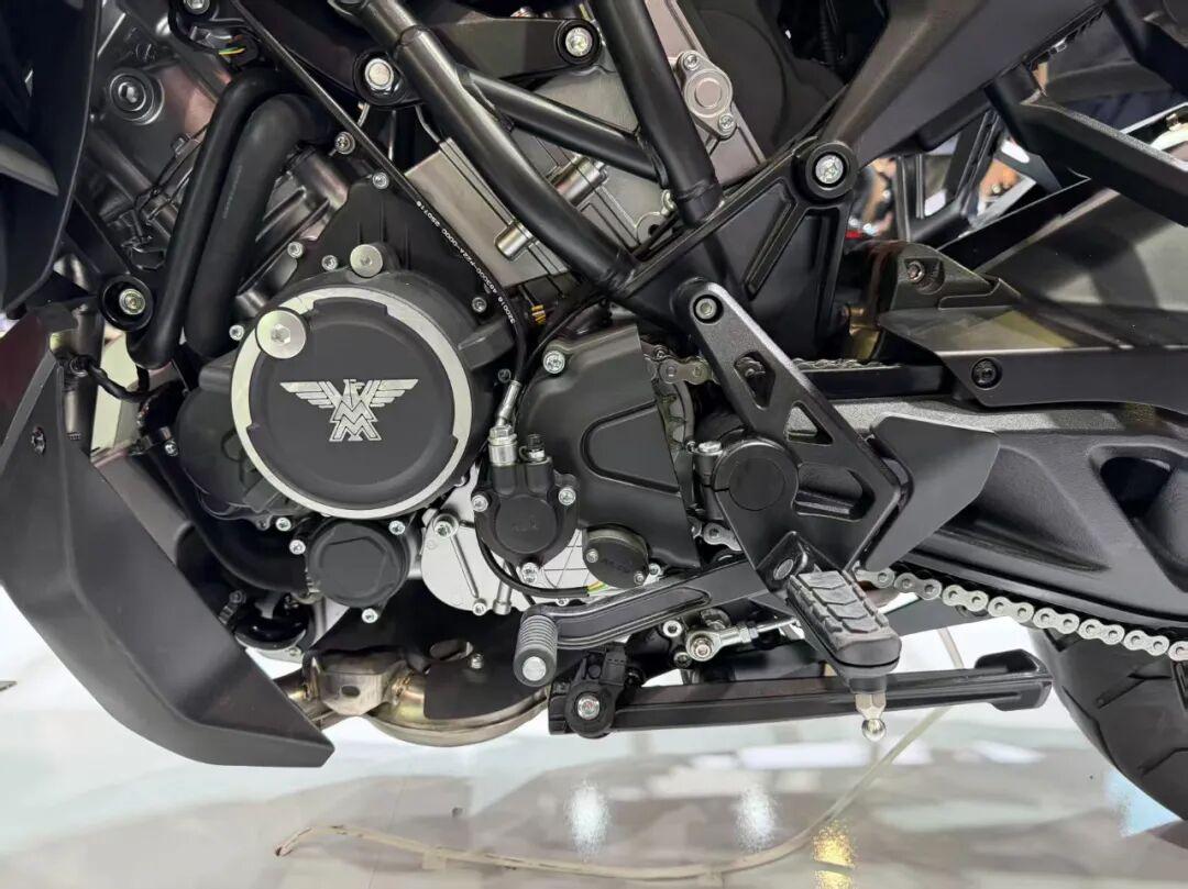 车头设计看似复杂,却呈现出干净利落的整体感。立体造型的进气口与灯组极具辨识度,油箱护板向前延伸至大灯两侧,与侧面的导流板共同营造出“悬浮”的视觉效果。转向灯也巧妙集成在手把护罩上,延续了这种悬浮设计的语言。再加上整车采用的组合式钢管编织车架,整体造型在目前国产车型中确实难寻对手。