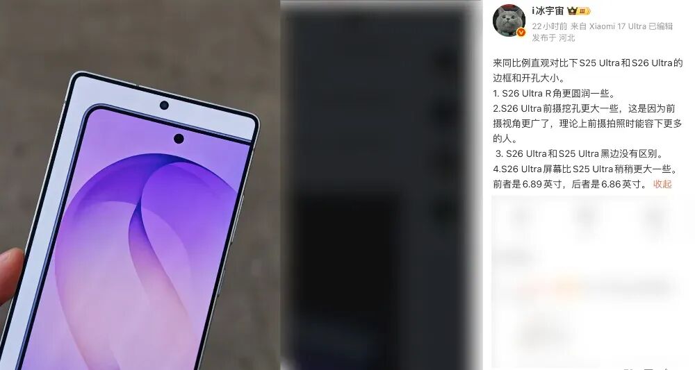 来同比例直观对比下S25 Ultra和S26 Ultra的边框和开孔大小。