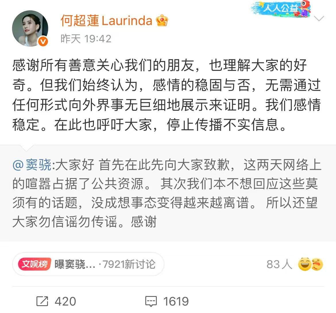 没想到这次闹剧,竟然以他和何超莲出面澄清作为“结束”,但两人的文案大有文章。