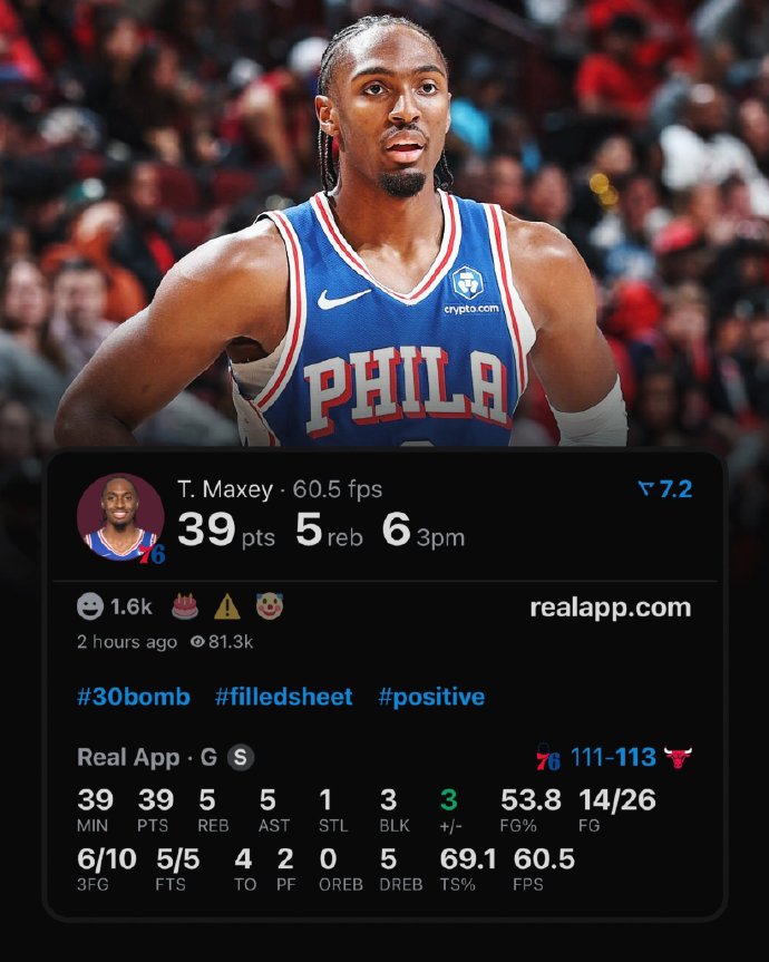马克西在自己的25岁生日夜依旧神勇无比,出战39分钟,26投14中,其中三分球10投6中,罚球5投5中,空砍39分5篮板5助攻1抢断3盖帽。上半场马克西10中8,其中三分7中5,罚球1中1,就已经得到22分2篮板4助攻。马克西本赛季已经两次砍下40+,另外还有两场都得到39分,只差一分就能拿到40+。