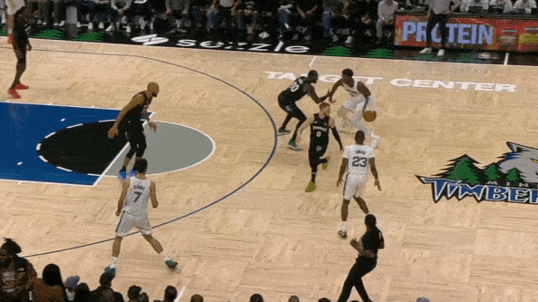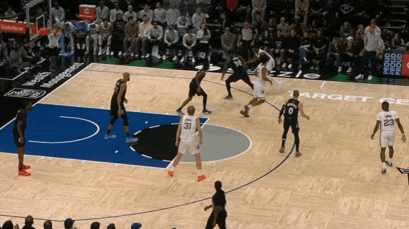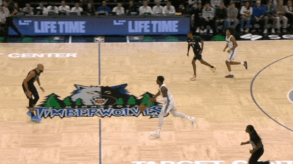 下球后迅速衔接“Crossover”走右路加速突破,直接过掉兰德尔后合球起步,无视回收协防的迪林上篮打进。