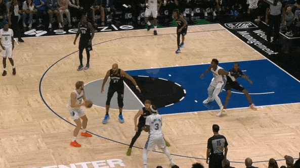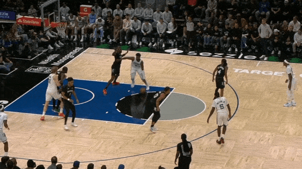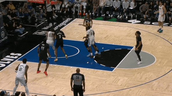 三分线外单打兰德尔,碾到肘区后背身对抗后连续的转身假动作骗飞兰德尔防守重心,随即衔接前转身抛投。